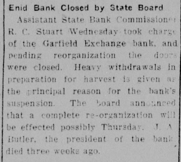 Enid Bank Closed by State Board Assistant State Bank Commissioner R. C. Stuart Wednesday took charge of the Garfield Exchange bank, and pending reorganization the doors were closed. Heavy withdrawals in preparation for harvest is given as the principal reason for the bank's suspension. The board announced that a complete re-organization will be effected possibly Thursday. J.A Butler, the president of the bank died three weeks ago.