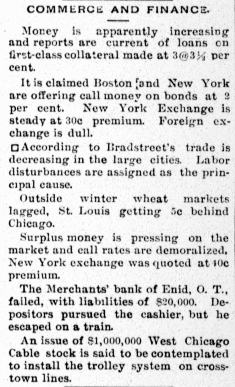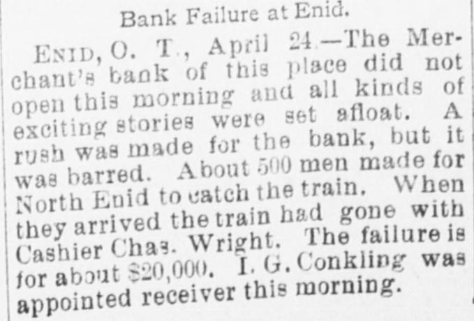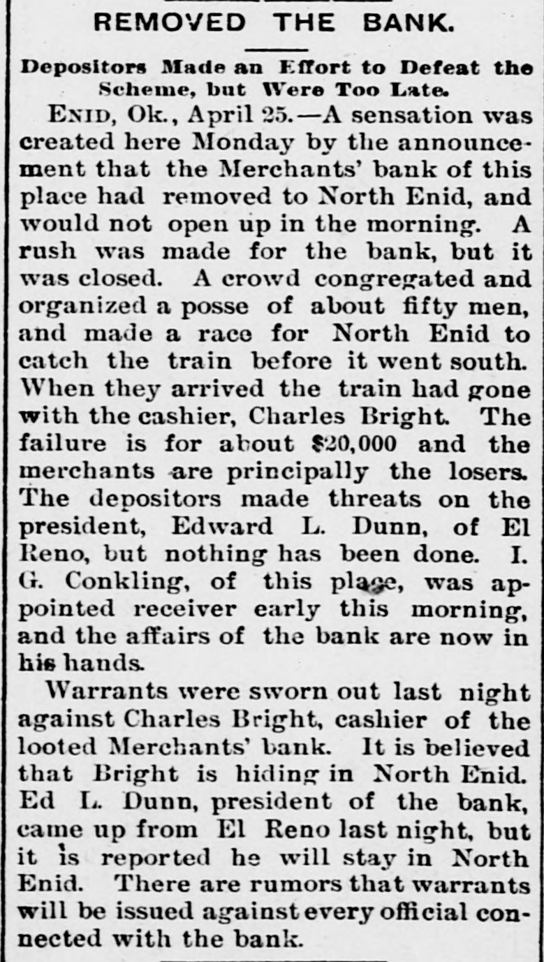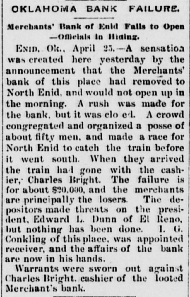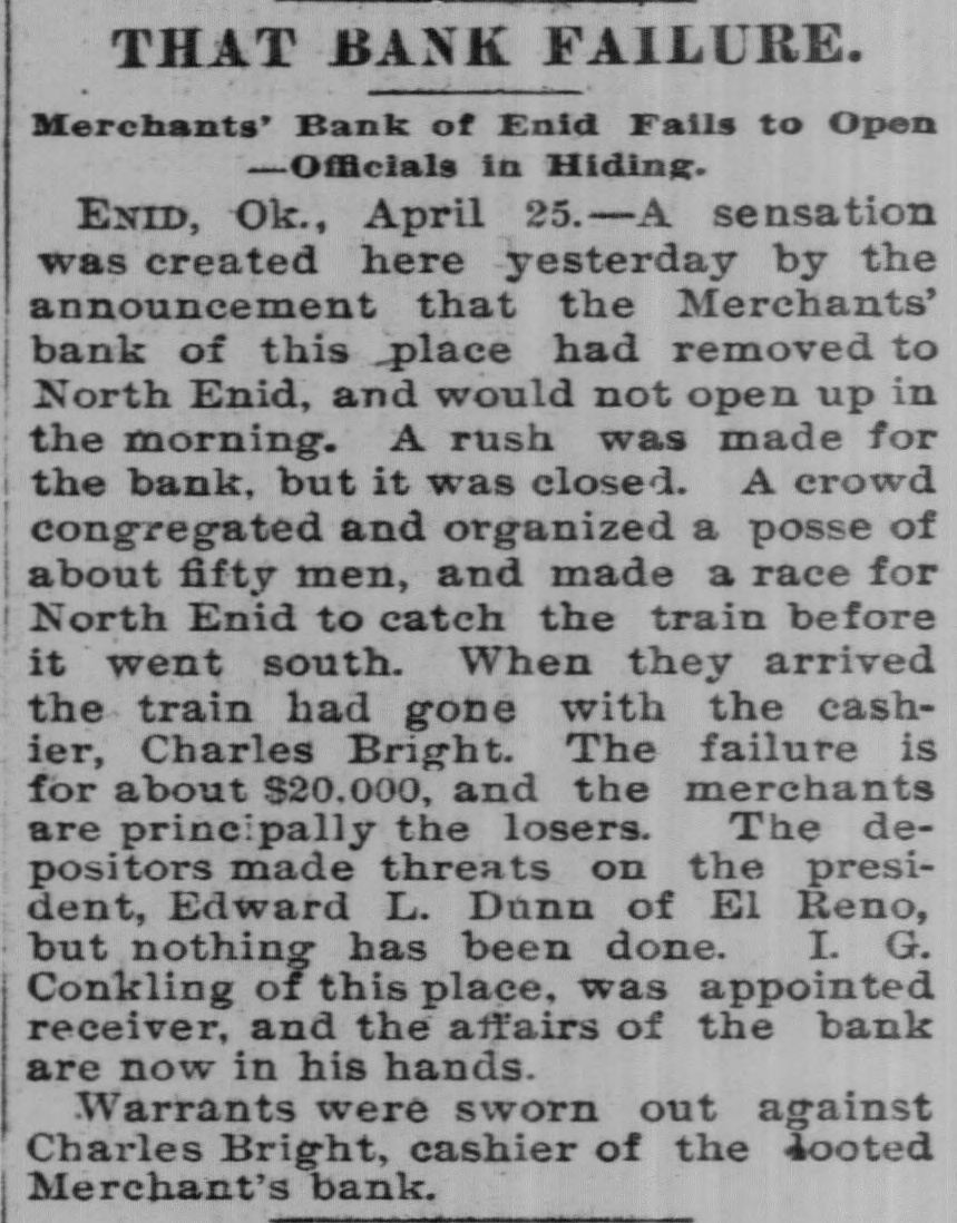 THAT BANK FAILURE. Merchants' Bank of Enid Fails to Open -Officials in Hiding. ENID, Ok., April 25.-A sensation was created here yesterday by the announcement that the Merchants' bank of this place had removed to North Enid, and would not open up in the morning. A rush was made for the bank, but it was closed. A crowd congregated and organized a posse of about fifty men, and made a race for North Enid to catch the train before it went south. When they arrived the train had gone with the cashier, Charles Bright. The failure is for about $20,000, and the merchants are principally the losers. The depositors made threats on the president, Edward L. Dunn of El Reno, but nothing has been done. I. G. Conkling of this place, was appointed receiver, and the affairs of the bank are now in his hands. Warrants were sworn out against Charles Bright, cashier of the looted Merchant's bank.