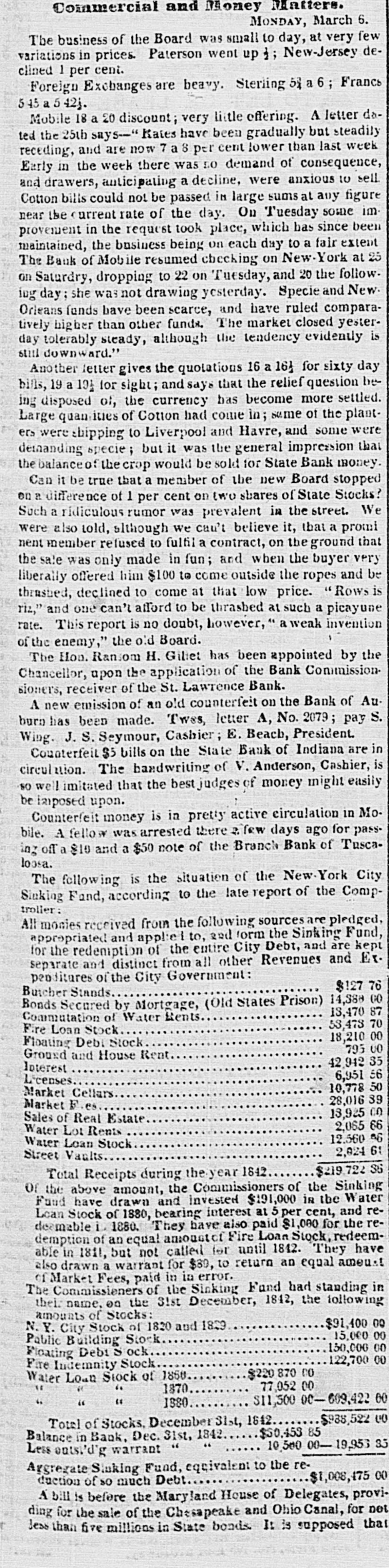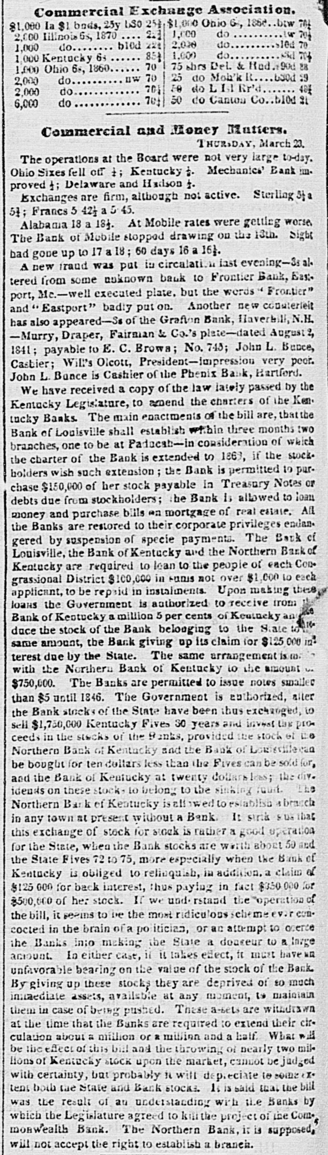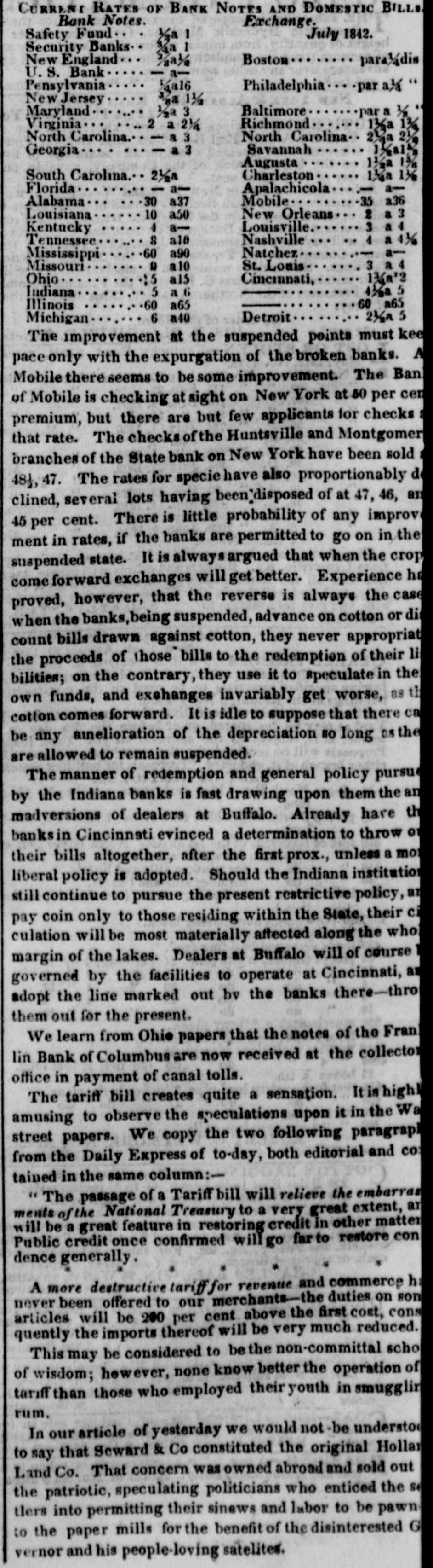 # CURRENT RATES OF BANK NOTES AND DOMESTIC BILLS Bank Notes. Exchange. July 1842. Safety Fund... ⅛a 1 Boston.... para⅛dis Security Banks... ⅛a 1 New England... ⅝a½ Philadelphia... par a¼ " U. S. Bank ¼a- Pensylvania ⅛a16 Baltimore.... para⅛ New Jersey ⅛a 1½ Richmond.. 1⅜a 1½ Maryland. 1½a 3 North Carolina 2¼a 2½ Virginia.. 2 a 2¼ Savannah 1¼al North Carolina.. - a 3 Augusta. 1½a 1⅝ Georgia... - a 3 Charleston 1⅛a 1⅜ South Carolina... 2⅛a Apalachicola -a- Florida a- Mobile -35 a36 Alabama 30 a37 New Orleans 2 a 3 Louisiana 10 a50 Louisville. 3 a 4 Kentucky 4 a- Nashville 4 a 4½ Tennessee 8 a10 Natchez a- Mississippi. -60 a90 St. Louis 3 a 4 Missouri. 9 a10 Cincinnati, 1¾a 2 Ohio. 15 a15 Indiana 5 a 6 Illinois -60 a65 Michigan 6 a40 Detroit 2⅜a 5 The improvement at the suspended points must keep pace only with the expurgation of the broken banks. At Mobile there seems to be some improvement. The Bank of Mobile is checking at sight on New York at 50 per cent premium, but there are but few applicants for checks at that rate. The checks of the Huntsville and Montgomery branches of the State bank on New York have been sold at 48¼, 47. The rates for specie have also proportionably declined, several lots having been disposed of at 47, 46, and 45 per cent. There is little probability of any improvement in rates, if the banks are permitted to go on in the suspended state. It is always argued that when the crops come forward exchanges will get better. Experience has proved, however, that the reverse is always the case when the banks, being suspended, advance on cotton or discount bills drawn against cotton, they never appropriate the proceeds of those bills to the redemption of their liabilities; on the contrary, they use it to speculate in their own funds, and exchanges invariably get worse, as the cotton comes forward. It is idle to suppose that there can be any amelioration of the depreciation so long as they are allowed to remain suspended. The manner of redemption and general policy pursued by the Indiana banks is fast drawing upon them the animadversions of dealers at Buffalo. Already have the banks in Cincinnati evinced a determination to throw out their bills altogether, after the first prox., unless a more liberal policy is adopted. Should the Indiana institutions still continue to pursue the present restrictive policy, and pay coin only to those residing within the State, their circulation will be most materially affected along the whole margin of the lakes. Dealers at Buffalo will of course be governed by the facilities to operate at Cincinnati, and adopt the line marked out by the banks there-through them out for the present. We learn from Ohio papers that the notes of the Franklin Bank of Columbus are now received at the collector's office in payment of canal tolls. The tariff bill creates quite a sensation. It is highly amusing to observe the speculations upon it in the Wall street papers. We copy the two following paragraphs from the Daily Express of to-day, both editorial and contained in the same column:- "The passage of a Tariff bill will relieve the embarrassments of the National Treasury to a very great extent, and will be a great feature in restoring credit in other matters. Public credit once confirmed will go far to restore confidence generally. A more destructive tariff for revenue and commerce has never been offered to our merchants-the duties on some articles will be 200 per cent above the first cost, consequently the imports thereof will be very much reduced. This may be considered to be the non-committal school of wisdom; however, none know better the operation of tariff than those who employed their youth in smuggling rum. In our article of yesterday we would not be understood to say that Seward & Co constituted the original Holland Land Co. That concern was owned abroad and sold out to the patriotic, speculating politicians who enticed the settlers into permitting their sinews and labor to be pawned to the paper mills for the benefit of the disinterested Governor and his people-loving satelites.
