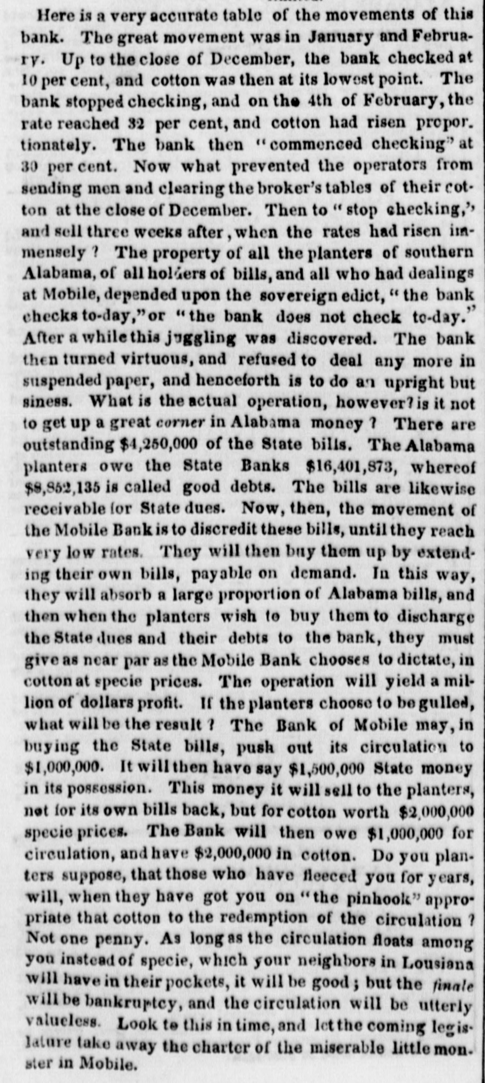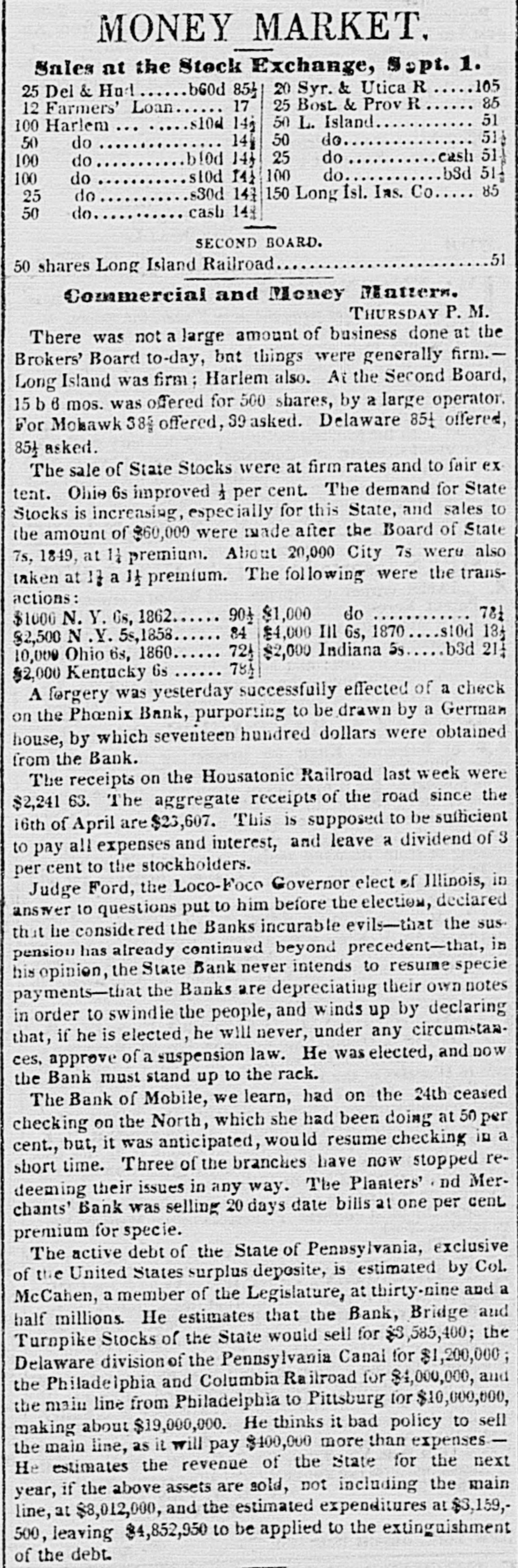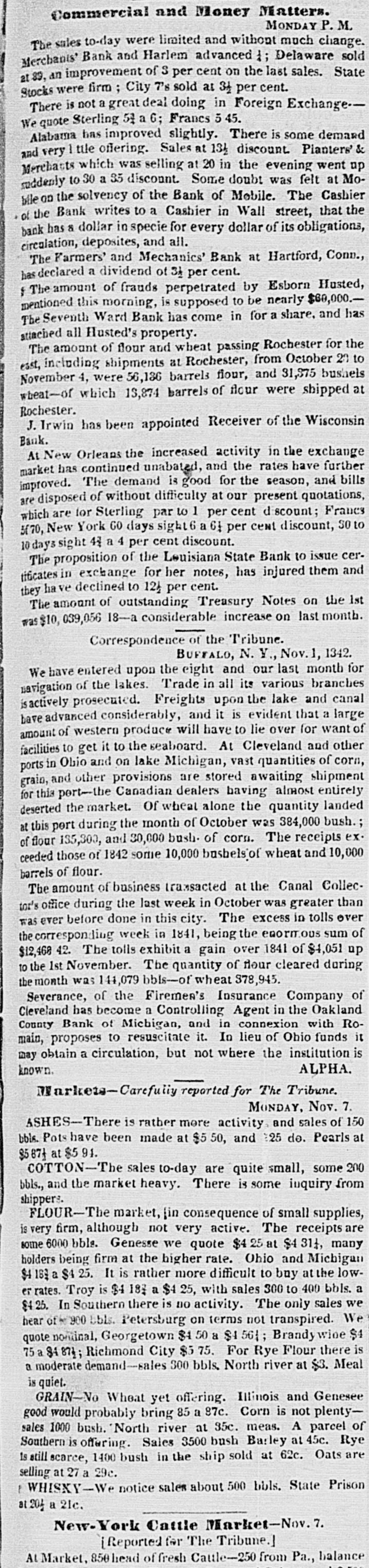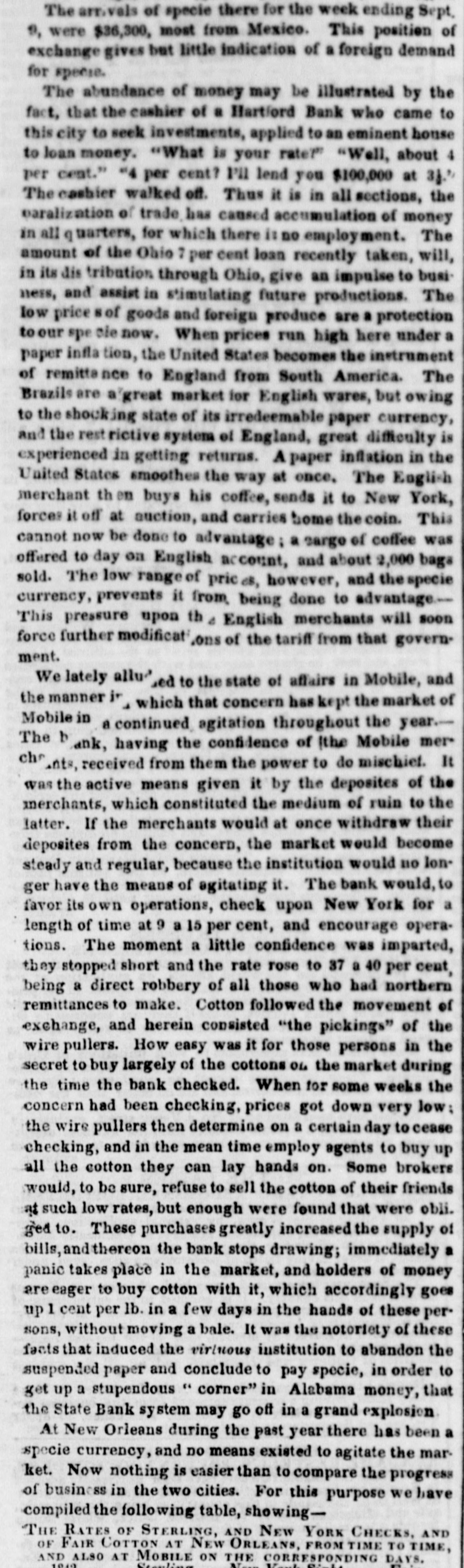 # CURRENT RATES OF BANK NOTES AND DOMESTIC BILLS Bank Notes. Exchange. July 1842. Safety Fund... ⅛a 1 Boston.... para⅛dis Security Banks... ⅛a 1 New England... ⅝a½ Philadelphia... par a¼ " U. S. Bank ¼a- Pensylvania ⅛a16 Baltimore.... para⅛ New Jersey ⅛a 1½ Richmond.. 1⅜a 1½ Maryland. 1½a 3 North Carolina 2¼a 2½ Virginia.. 2 a 2¼ Savannah 1¼al North Carolina.. - a 3 Augusta. 1½a 1⅝ Georgia... - a 3 Charleston 1⅛a 1⅜ South Carolina... 2⅛a Apalachicola -a- Florida a- Mobile -35 a36 Alabama 30 a37 New Orleans 2 a 3 Louisiana 10 a50 Louisville. 3 a 4 Kentucky 4 a- Nashville 4 a 4½ Tennessee 8 a10 Natchez a- Mississippi. -60 a90 St. Louis 3 a 4 Missouri. 9 a10 Cincinnati, 1¾a 2 Ohio. 15 a15 Indiana 5 a 6 Illinois -60 a65 Michigan 6 a40 Detroit 2⅜a 5 The improvement at the suspended points must keep pace only with the expurgation of the broken banks. At Mobile there seems to be some improvement. The Bank of Mobile is checking at sight on New York at 50 per cent premium, but there are but few applicants for checks at that rate. The checks of the Huntsville and Montgomery branches of the State bank on New York have been sold at 48¼, 47. The rates for specie have also proportionably declined, several lots having been disposed of at 47, 46, and 45 per cent. There is little probability of any improvement in rates, if the banks are permitted to go on in the suspended state. It is always argued that when the crops come forward exchanges will get better. Experience has proved, however, that the reverse is always the case when the banks, being suspended, advance on cotton or discount bills drawn against cotton, they never appropriate the proceeds of those bills to the redemption of their liabilities; on the contrary, they use it to speculate in their own funds, and exchanges invariably get worse, as the cotton comes forward. It is idle to suppose that there can be any amelioration of the depreciation so long as they are allowed to remain suspended. The manner of redemption and general policy pursued by the Indiana banks is fast drawing upon them the animadversions of dealers at Buffalo. Already have the banks in Cincinnati evinced a determination to throw out their bills altogether, after the first prox., unless a more liberal policy is adopted. Should the Indiana institutions still continue to pursue the present restrictive policy, and pay coin only to those residing within the State, their circulation will be most materially affected along the whole margin of the lakes. Dealers at Buffalo will of course be governed by the facilities to operate at Cincinnati, and adopt the line marked out by the banks there-through them out for the present. We learn from Ohio papers that the notes of the Franklin Bank of Columbus are now received at the collector's office in payment of canal tolls. The tariff bill creates quite a sensation. It is highly amusing to observe the speculations upon it in the Wall street papers. We copy the two following paragraphs from the Daily Express of to-day, both editorial and contained in the same column:- "The passage of a Tariff bill will relieve the embarrassments of the National Treasury to a very great extent, and will be a great feature in restoring credit in other matters. Public credit once confirmed will go far to restore confidence generally. A more destructive tariff for revenue and commerce has never been offered to our merchants-the duties on some articles will be 200 per cent above the first cost, consequently the imports thereof will be very much reduced. This may be considered to be the non-committal school of wisdom; however, none know better the operation of tariff than those who employed their youth in smuggling rum. In our article of yesterday we would not be understood to say that Seward & Co constituted the original Holland Land Co. That concern was owned abroad and sold out to the patriotic, speculating politicians who enticed the settlers into permitting their sinews and labor to be pawned to the paper mills for the benefit of the disinterested Governor and his people-loving satelites.