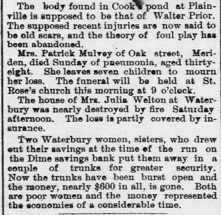 The body found in Cook pond at Plainville is supposed to be that of Walter Prior. The supposed recent injuries are now said to be old scars, and the theory of foul play has been abandoned. Mrs. Patrick Mulvey of Oak street, Meriden, died Sunday of pneumonia, aged thirtyeight. She leaves seven children to mourn her loss. The funeral will be held at St. Rose's church this morning at 9 o'clock. The house of Mrs. Julia Welton at Waterbury was nearly destroyed by fire Saturday afternoon. The loss is partly covered by insurance. Two Waterbury women, sisters, who drew out their savings at the time of the run on the Dime savings bank put them away in a couple of trunks for greater security. Now the trunks have been burst open and the money, nearly $600 in all, is gone. Both are poor women and the money represented the economies of a considerable time.