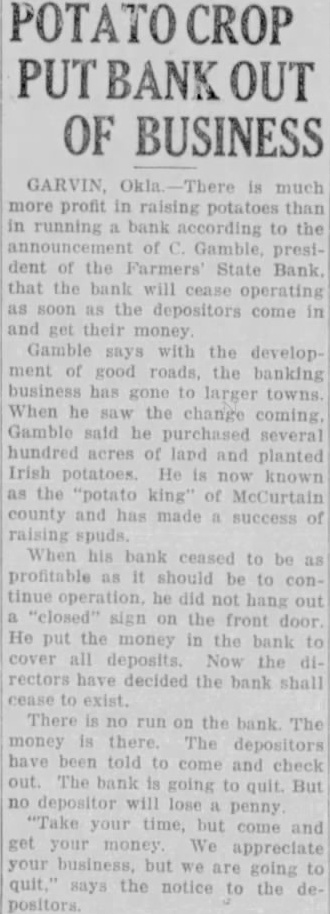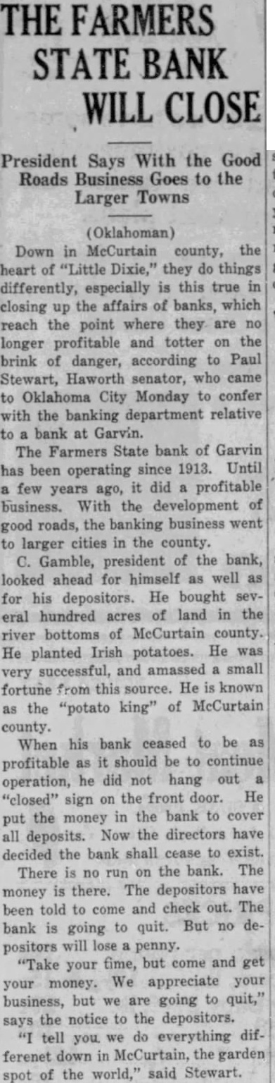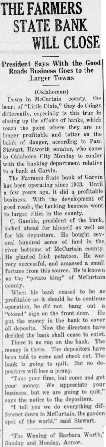 THE FARMERS STATE BANK WILL CLOSE President Says With the Good Roads Business Goes to the Larger Towns (Oklahoman) Down in McCurtain county, the heart of "Little Dixie," they do things differently, especially is this true in closing up the affairs of banks, which reach the point where they are no longer profitable and totter on the brink of danger, according to Paul Stewart, Haworth senator, who came to Oklahoma City Monday to confer with the banking department relative to a bank at Garvin. The Farmers State bank of Garvin has been operating since 1913. Until a few years ago, it did a profitable business. With the development of good roads, the banking business went to larger cities in the county. C. Gamble, president of the bank, looked ahead for himself as well as for his depositors. He bought several hundred acres of land in the river bottoms of McCurtain county. He planted Irish potatoes. He was very successful, and amassed a small fortune from this source. He is known as the "potato king" of McCurtain county. When his bank ceased to be as profitable as it should be to continue operation, he did not hang out a "closed" sign on the front door. He put the money in the bank to cover all deposits. Now the directors have decided the bank shall cease to exist. There is no run on the bank. The money is there. The depositors have been told to come and check out. The bank is going to quit. But no depositors will lose a penny. "Take your time, but come and get your money. We appreciate your business, but we are going to quit," says the notice to the depositors. "I tell you we do everything differenet down in McCurtain. the garden spot of the world," said Stewart.