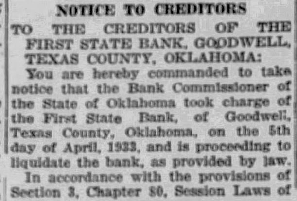 January 5, 1934, Goodwell-First State Bank, from moratorium to liquidation.