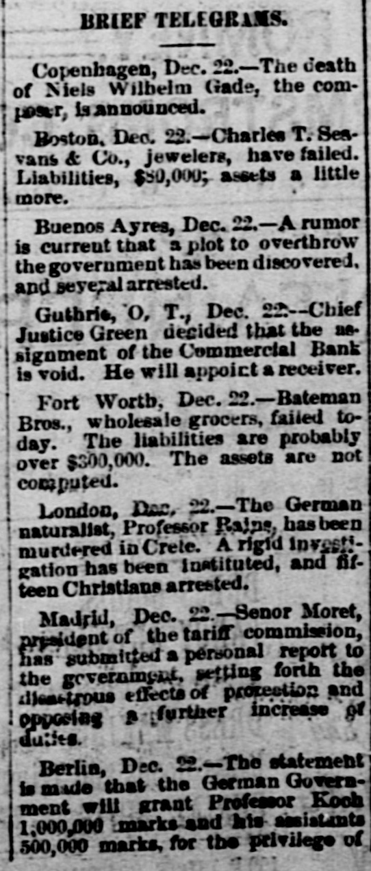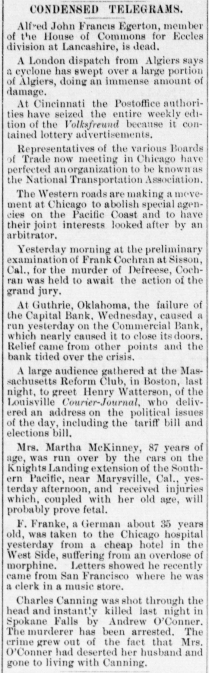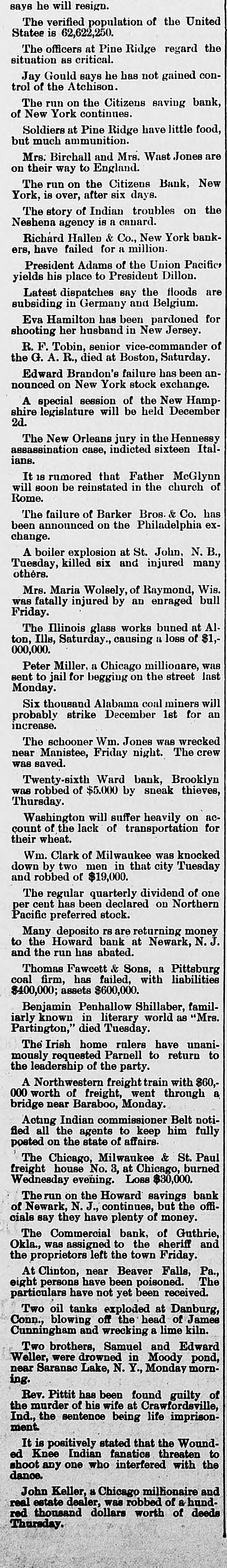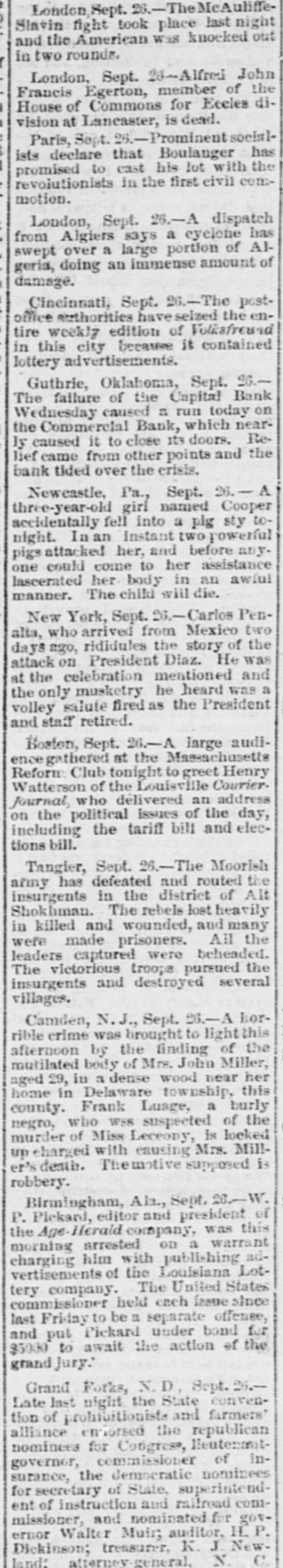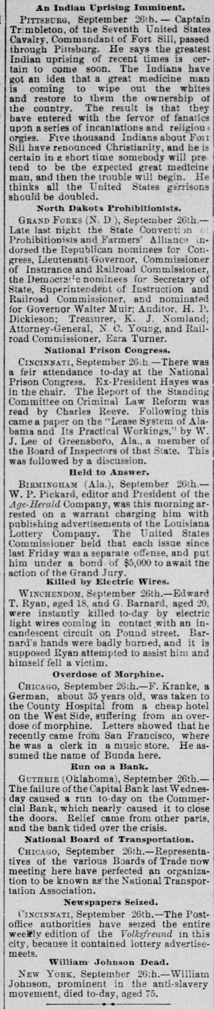 An Indian Uprising Imminent. PITTSBURG, September 26th. - Captain Trimbleton, of the Seventh United States Cavalry, Commandant of Fort Sill, passed through Pittsburg. He says the greatest Indian uprising of recent times is certain to come soon. The Indians have got an idea that a great medicine man is coming to wipe out the whites and restore to them the ownership of the country. The result is that they have entered with the fervor of fanatics upon a series of incantations and religiou orgies. Five thousand Indians about Fort Sill have renounced Christianity, and he is certain in 2 short time somebody will pretend to be the expected great medicine man, and then the trouble will begin. He thinks all the United States garrisons should be doubled. North Dakots Prohibitionists. GRAND FORKS (N. D), September 26th.Late last night the State Convention Prohibitionists and Farmers' Alliance indorsed the Republican nominees for Congress, Lieutenant Governor, Commissioner of Insurance and Railroad Commissioner, the Democratic nominees for Secretary of State, Superintendent of Instruction and Railroad Commissioner, and nominated for Governor Walter Muir; Auditor, H. P. Dickieson; Treasurer, K. J. Nomland; Attorney-General, N. C. Young, and Railroad Commissioner, Ezra Turner. National Prison Congress. CINCINNATI, September 26th.-There was a fair attendance to-day at the National Prison Congress. Ex-President Hayes was in the chair. The Report of the Standing Committee on Criminal Law Reform was read by Charles Reeve. Following this came a paper on the "Lease System of Alabama an Its Practical Workings," by W. J. Lee of Greensboro, Ala., a member of the Board of Inspectors of that State. This was followed by a discussion. Held to Answer. BIRMINGHAM (Ala.), September 26th.W.P. Pickard, editor and President of the Age-Heraid Company, was this morning rested on a warrant charging him with publishing advertisements of the Louisiana Lottery Company. The United States Commissioner held that each issue since last Friday was a separate offense, and put him under a bond of $5,000 to await the action of the Grand Jury. Killed by Electric Wires. WINCHENDOM, September 26th.-Edward T. Ryan, aged 18, and G. Barnard, aged 20, were instantly killed to-day by electric light wires coming in contact with an incandescent circuit on Pound street. Barnard's hands were badly burned, and it is supposed Ryan attempted to assist him and himself fell a victim. Overdose of Morphine. CHICAGO, September 26th.-F. Kranke, a German, about 35 years old, was taken to the County Hospital from a cheap hotel on the West Side, suffering from an overdose of morphine. Letters showed that he recently came from San Francisco, where he was a clerk in a music store. He assumed the name of Bunda here. Run on a Bank. GUTHRIE (Oklahoma), September 26th.The failure of the Capital Bank last Wednesday caused a run to day on the Commercial Bank, which nearly caused it to close the doors. Relief came from other parts, and the bank tided over the crisis. National Board of Transportation. CHICAGO, September 26th.-Representatives of the various Boards of Trade now meeting here have perfected an organization to be known as the National Transportation Association. Newspapers Seized. CINCINNATI, September 26th.-The Postoffice authorities have seized the entire weekly edition of the Volksfreund in this city, because it contained lottery advertisemeets. William Johnson Dead. NEW YORK, September 26:h.-William Johnson, prominent in the anti-slavery movement, died to-day, aged 75.