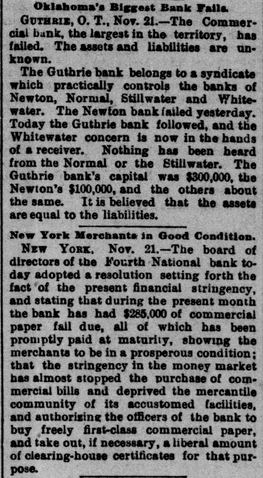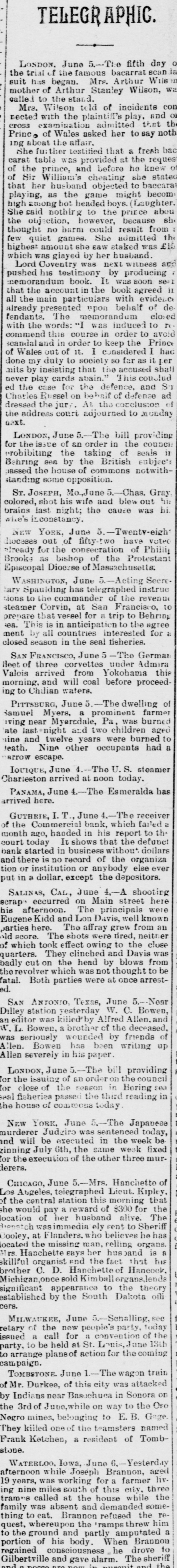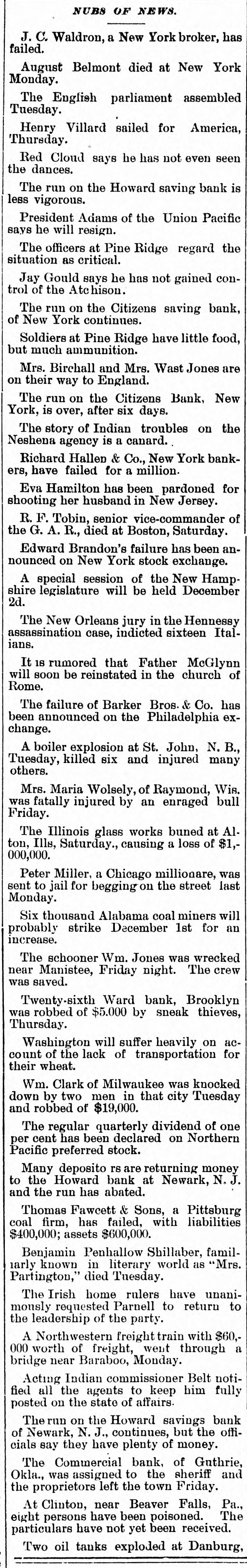 NUBS OF NEWS. J. C. Waldron, a New York broker, has failed. August Belmont died at New York Monday. The English parliament assembled Tuesday. Henry Villard sailed for America, Thursday. Red Cloud says he has not even seen the dances. The run on the Howard saving bank is less vigorous. President Adams of the Union Pacific says he will resign. The officers at Pine Ridge regard the situation as critical. Jay Gould says he has not gained control of the Atchison. The run on the Citizens saving bank, of New York continues. Soldiers at Pine Ridge have little food, but much ammunition. Mrs. Birchall and Mrs. Wast Jones are on their way to England. The run on the Citizens Bank, New York, is over, after six days. The story of Indian troubles on the Neshena agency is a canard. Richard Hallen & Co., New York bankers, have failed for a million. Eva Hamilton has been pardoned for shooting her husband in New Jersey. R. F. Tobin, senior vice-commander of the G. A. R., died at Boston, Saturday. Edward Brandon's failure has been announced on New York stock exchange. A special session of the New Hampshire legislature will be held December 2d. The New Orleans jury in the Hennessy assassination case, indicted sixteen Italians. It IS rumored that Father McGlynn will soon be reinstated in the church of Rome. The failure of Barker Bros. & Co. has been announced on the Philadelphia exchange. A boiler explosion at St. John, N. B., Tuesday, killed six and injured many others. Mrs. Maria Wolsely, of Raymond, Wis. was fatally injured by an enraged bull Friday. The Illinois glass works buned at Alton, Ills, Saturday., causing a loss of $1,000,000. Peter Miller, a Chicago millionare, was sent to jail for begging on the street last Monday. Six thousand Alabama coal miners will probably strike December 1st for an increase. The schooner Wm. Jones was wrecked near Manistee, Friday night. The crew was saved. Twenty-sixth Ward bank, Brooklyn was robbed of $5.000 by sneak thieves, Thursday. Washington will suffer heavily on account of the lack of transportation for their wheat. Wm. Clark of Milwaukee was knocked down by two men in that city Tuesday and robbed of $19,000. The regular quarterly dividend of one per cent has been declared on Northern Pacific preferred stock. Many deposito rs are returning money to the Howard bank at Newark, N. J. and the run has abated. Thomas Fawcett & Sons, a Pittsburg coal firm, has failed, with liabilities $400,000; assets $600,000. Benjamin Penhallow Shillaber, familiarly known in literary world as "Mrs. Partington," died Tuesday. The Irish home rulers have unanimously requested Parnell to return to the leadership of the party. A Northwestern freight train with $60,000 worth of freight, went through a bridge near Baraboo, Monday. Acting Indian commissioner Belt notified all the agents to keep him fully posted on the state of affairs. The run on the Howard savings bank of Newark, N. J., continues, but the officials say they have plenty of money. The Commercial bank, of Guthrie, Okla., was assigned to the sheriff and the proprietors left the town Friday. At Clinton, near Beaver Falls, Pa., eight persons have been poisoned. The particulars have not yet been received. Two oil tanks exploded at Danburg,