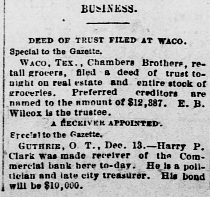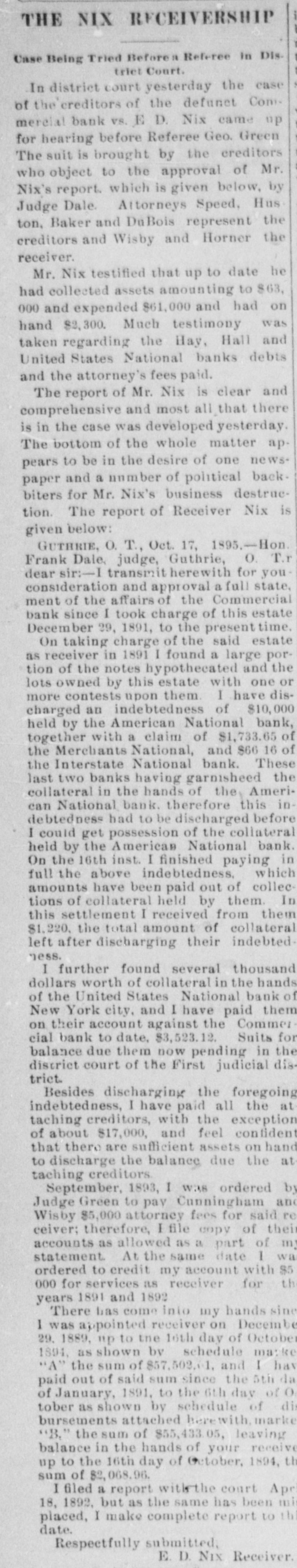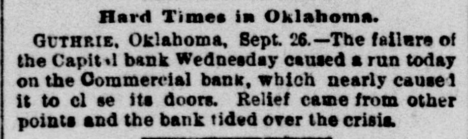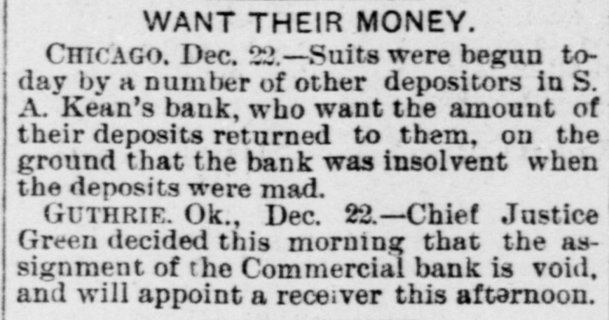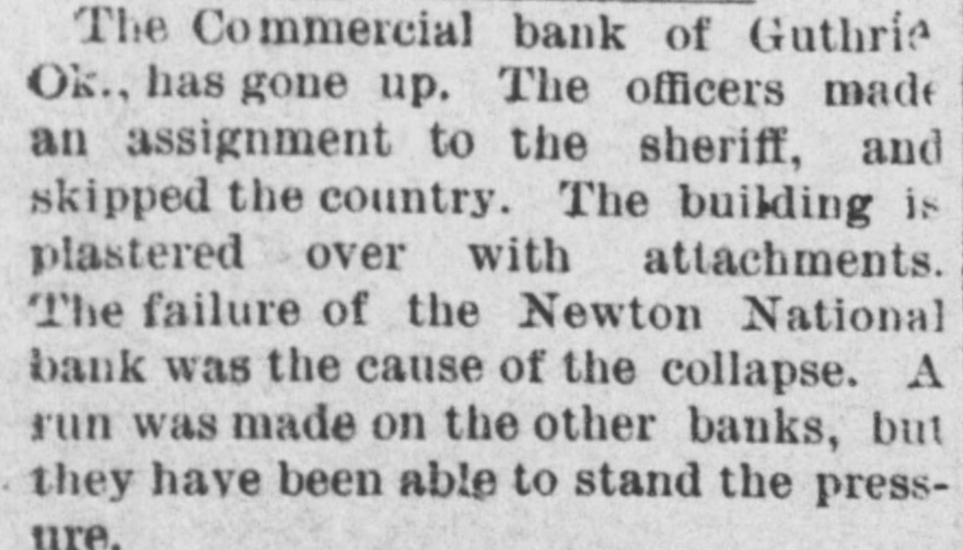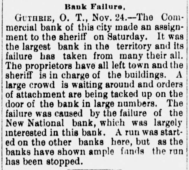 NUBS OF NEWS. J. C. Waldron, a New York broker, has failed. August Belmont died at New York Monday. The English parliament assembled Tuesday. Henry Villard sailed for America, Thursday. Red Cloud says he has not even seen the dances. The run on the Howard saving bank is less vigorous. President Adams of the Union Pacific says he will resign. The officers at Pine Ridge regard the situation as critical. Jay Gould says he has not gained control of the Atchison. The run on the Citizens saving bank, of New York continues. Soldiers at Pine Ridge have little food, but much ammunition. Mrs. Birchall and Mrs. Wast Jones are on their way to England. The run on the Citizens Bank, New York, is over, after six days. The story of Indian troubles on the Neshena agency is a canard. Richard Hallen & Co., New York bankers, have failed for a million. Eva Hamilton has been pardoned for shooting her husband in New Jersey. R. F. Tobin, senior vice-commander of the G. A. R., died at Boston, Saturday. Edward Brandon's failure has been announced on New York stock exchange. A special session of the New Hampshire legislature will be held December 2d. The New Orleans jury in the Hennessy assassination case, indicted sixteen Italians. It IS rumored that Father McGlynn will soon be reinstated in the church of Rome. The failure of Barker Bros. & Co. has been announced on the Philadelphia exchange. A boiler explosion at St. John, N. B., Tuesday, killed six and injured many others. Mrs. Maria Wolsely, of Raymond, Wis. was fatally injured by an enraged bull Friday. The Illinois glass works buned at Alton, Ills, Saturday., causing a loss of $1,000,000. Peter Miller, a Chicago millionare, was sent to jail for begging on the street last Monday. Six thousand Alabama coal miners will probably strike December 1st for an increase. The schooner Wm. Jones was wrecked near Manistee, Friday night. The crew was saved. Twenty-sixth Ward bank, Brooklyn was robbed of $5.000 by sneak thieves, Thursday. Washington will suffer heavily on account of the lack of transportation for their wheat. Wm. Clark of Milwaukee was knocked down by two men in that city Tuesday and robbed of $19,000. The regular quarterly dividend of one per cent has been declared on Northern Pacific preferred stock. Many deposito rs are returning money to the Howard bank at Newark, N. J. and the run has abated. Thomas Fawcett & Sons, a Pittsburg coal firm, has failed, with liabilities $400,000; assets $600,000. Benjamin Penhallow Shillaber, familiarly known in literary world as "Mrs. Partington," died Tuesday. The Irish home rulers have unanimously requested Parnell to return to the leadership of the party. A Northwestern freight train with $60,000 worth of freight, went through a bridge near Baraboo, Monday. Acting Indian commissioner Belt notified all the agents to keep him fully posted on the state of affairs. The run on the Howard savings bank of Newark, N. J., continues, but the officials say they have plenty of money. The Commercial bank, of Guthrie, Okla., was assigned to the sheriff and the proprietors left the town Friday. At Clinton, near Beaver Falls, Pa., eight persons have been poisoned. The particulars have not yet been received. Two oil tanks exploded at Danburg,