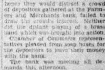 hopes they would distract a crowd of gathered at the Farmers and Merchants bank failed to did the distant playing of a hrass Clamber of Commerce representatives pleaded from somp boxes for the depositors to leave their money with the bank. The bank WAS meeting all de-
