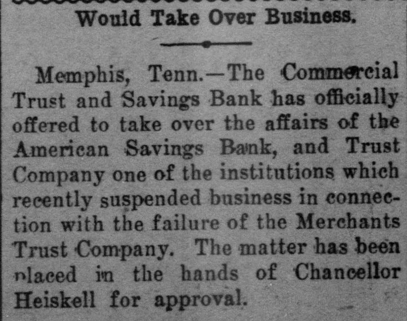 LITTLE EXCITEMENT Trust Company Drags Downs Two Smaller Institutions in its Train.Condensed Statement Showing Assets and Liabilities.-$30,000 Actual Cash on Hand. Memphis, Tenn., Dec. 27.-The Merchants' Trust Company has closed its doors and a receiver has been appointed. The institution had a capital of $200,000. The American Savings Bank and Trust Company and the Merchants' Savings Bank have suspended business. These are small institutions allied with the Merchants Trust Company. The cause of the suspension of the Merchants' Trust Company is said to have been loans and discounts. The Merchants' Trust Co. recently absorbed the Memphis National Bank, and it is stated owns the controlling stock of the American Savings Bank and Trust Co. The latter institution has practically absorbed the Mechanics' Savings Bank. The suspension of the three institutions caused but little excitement in financial circles. A condensed statement of the conf dition of the Merchants' Trust Co. at the close of business Dec. 26 was given out, as follows: Total assets $3,665,055; indebtedness of every character to depositors, $3,132,319. All other obligations exclusive of cap ital stock, $889,058. Cash actually on hand, $30,000. New York, Dec. 27.-The American Savings Bank and Trust Company of Memphis, according to a recent statement, owed depositors $625,000.