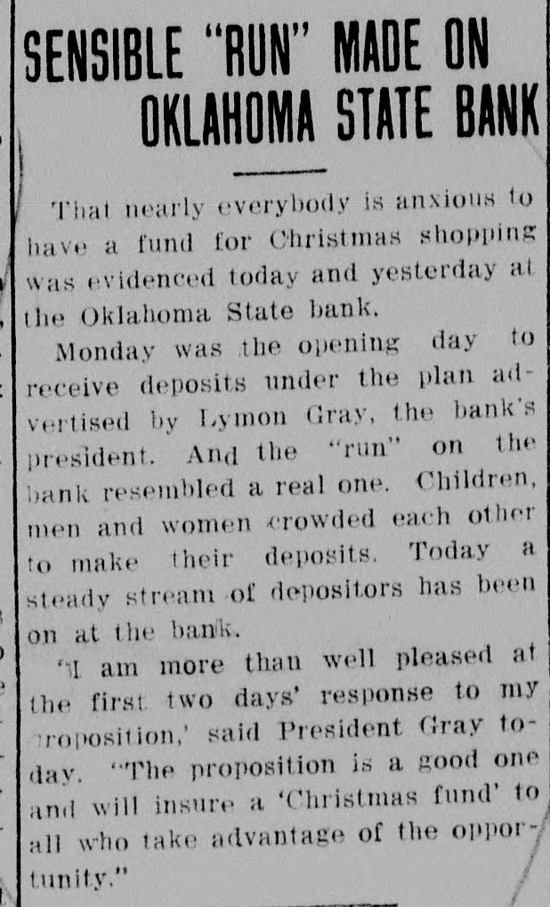 SENSIBLE "RUN" MADE ON OKLAHOMA STATE BANK That nearly everybody is anxious to have a fund for Christmas shopping was evidenced today and yesterday at the Oklahoma State bank. Monday was the opening day to receive deposits under the plan advertised by Lymon Gray, the bank's president. And the "run" on the bank resembled a real one. Children, men and women crowded each other to make their deposits. Today a steady stream of depositors has been on at the bank. "I am more than well pleased at the first two days' response to my proposition,' said President Gray today. "The proposition is a good one and will insure a 'Christmas fund' to all who take advantage of the opportunity."