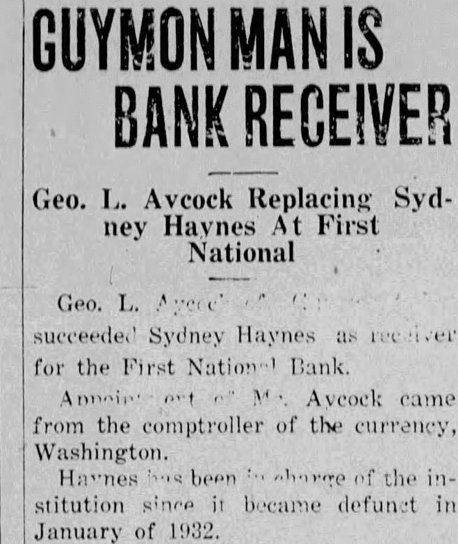 GUYMON MAN BANK RECEIVER Geo. L. Aveock Replacing Sydney Haynes At First National Geo. L. Avere succeeded Sydney Haynes as receiver for the First National Bank. from the comptroller of the currency, Washington. Havnes has been charge of the institution since it became defunct in January of 1932.