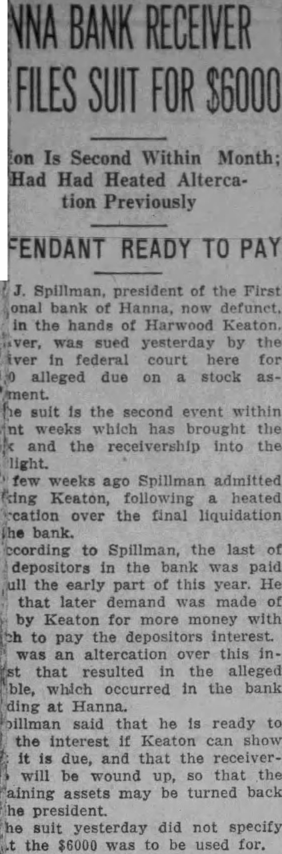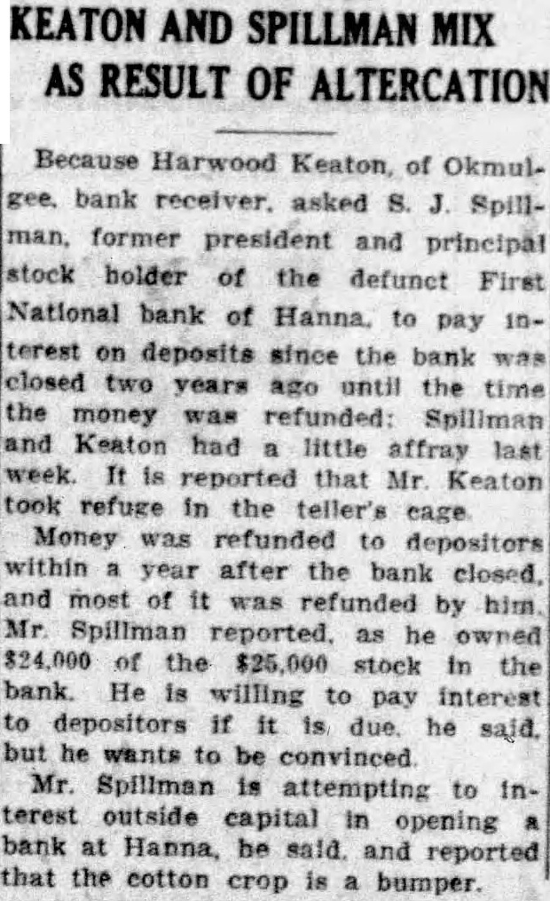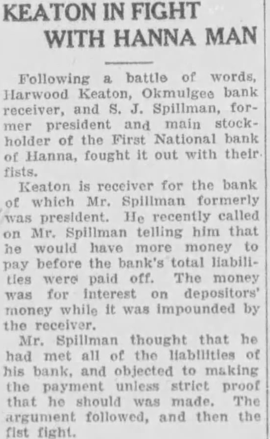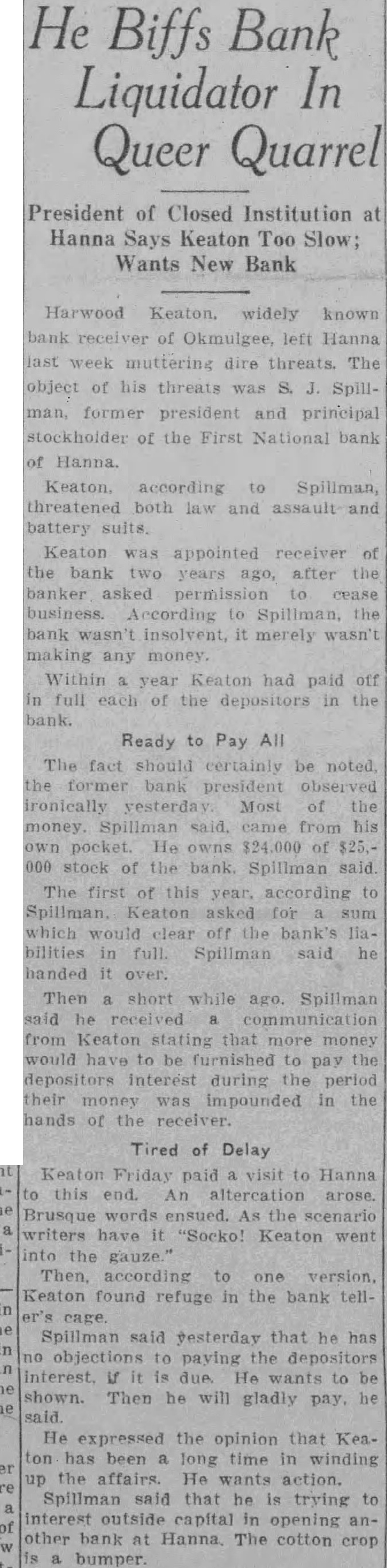 He Biffs Bank Liquidator In Queer Quarrel President of Closed Institution at Hanna Says Keaton Too Slow; Wants New Bank Harwood Keaton. widely known receiver of Okmulgee, left Hanna week muttering dire threats. The object his threats was S. Spillformer president principal stockholder of the First National bank Hanna. Keaton. according to Spillman, threatened both and assault battery Keaton was appointed receiver the bank years after banker asked permission to cease According to Spillman, bank wasn't insolvent, it merely wasn't any money. Within year Keaton had paid full each of the in bank. Ready to Pay All The fact should certainly be noted former bank president ironically yesterday Most of money Spillman said, came from his pocket. He owns of 000 stock of the bank. Spillman said The first of this year. according would clear the bank's full. Spillman said handed Then short while ago. Spillman said he from Keaton that more money would be to pay the depositors Interest during the period their was impounded in the hands of the receiver. Tired of Delay Keaton Friday paid visit to Hanna this end. altercation arose. Brusque the writers have "Socko! Keaton went the Then according to one Keaton found refuge in the bank tellcage Spillman said yesterday that he has paying the depositors Interest, He wants to shown. Then he will gladiy pay. He expressed the opinion that Keaton has been long time winding up the affairs. He wants action. Spillman said that he trying interest outside capital in opening another bank at Hanna The cotton crop bumper.