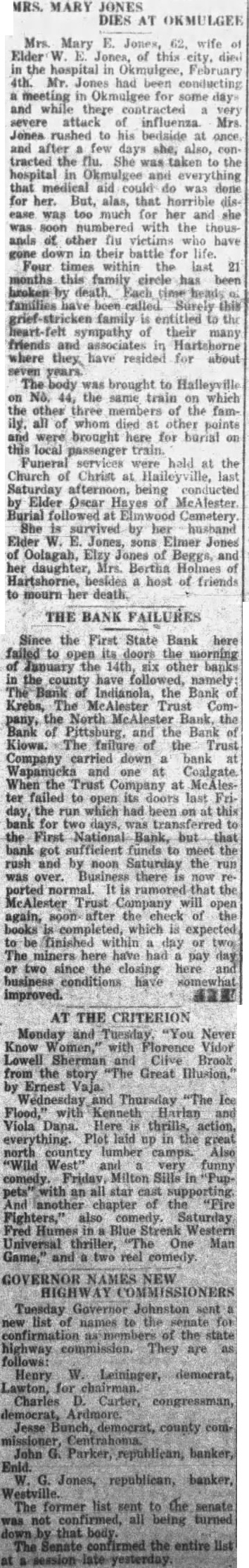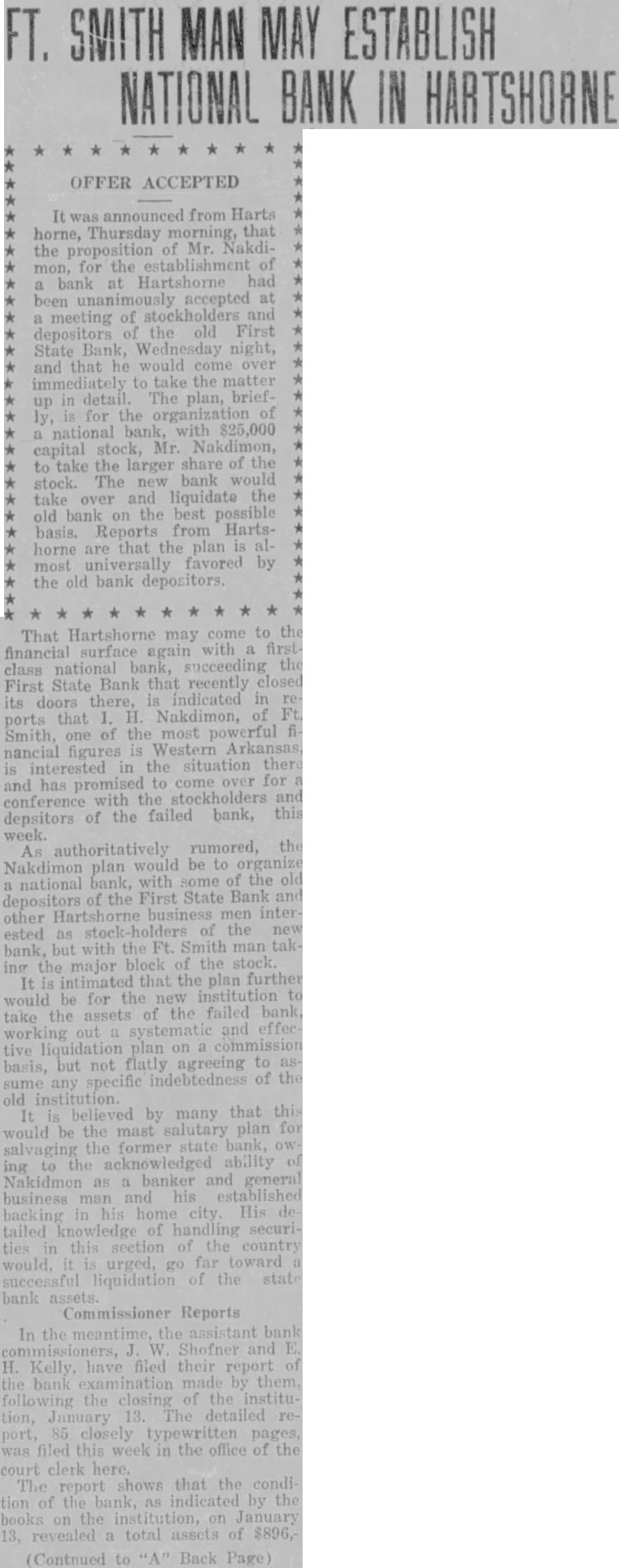 FT. SMITH MAN MAY ESTABLISH NATIONAL BANK IN HARTSHORNE OFFER ACCEPTED It was announced from Harts horne, Thursday morning, that the proposition of Mr. Nakdimon, for the establishment of bank at Hartshorne had been accepted at meeting of stockholders and depositors the old First State Bank, night, and that he would come over immediately to take the matter up in detail. The plan, briefis for the organization national bank, with $25,000 capital stock, Mr. Nakdimon, to take the larger share of the stock. The new bank would take over and liquidate the old bank on the best possible basis. Reports from Hartshorne are that the plan most favored by the old bank That Hartshorne may come to financial surface again with first class bank, the First State Bank that recently closed its doors there, indicated in ports that Nakdimon, of Smith, one of the most powerful nancial figures is Western Arkansas, interested in the situation there for and has promised to come conference with and depsitors of the failed bank, this As authoritatively rumored, the Nakdimon plan would be to organize national bank, with some of the old depositors of the First State Bank other Hartshorne business men inter ested as holders of the new bank, but with the Ft. Smith man ing the major block of the stock. It that the plan further would be for the to take the assets of the failed bank, working effec tive liquidation plan on basis, but not flatly agreeing to sume specific indebtedness of the old institution. It believed by many that this would be the mast salutary plan for salvaging the former bank, ing to acknowledged ability Nakidmon as banker and general business man and his established backing His tailed knowledge of handling securi ties this of the country urged, far toward go successful liquidation of the state bank assets Commissioner Reports In the meantime, the bank commissioners, W Shofner and H. Kelly, have filed their report the bank examination made by them. the closing of the instituJanuary 13. The detailed port, 85 closely pages, filed this week in the office of the court clerk report shows that the condi tion of the as indicated by the books the on January 13, revealed total assets of $896, (Contnued to Back Page)