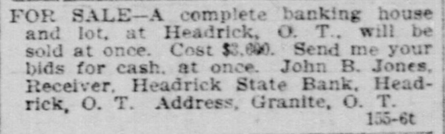 FOR SALE-A complete banking house and lot, at Headrick, 0. T., will be sold at once. Cost $3,690. Send me your bids for cash. at once. John B. Jones, Receiver, Headrick State Bank, Headrick, O. T. Address, Granite, O. T. 155-6t