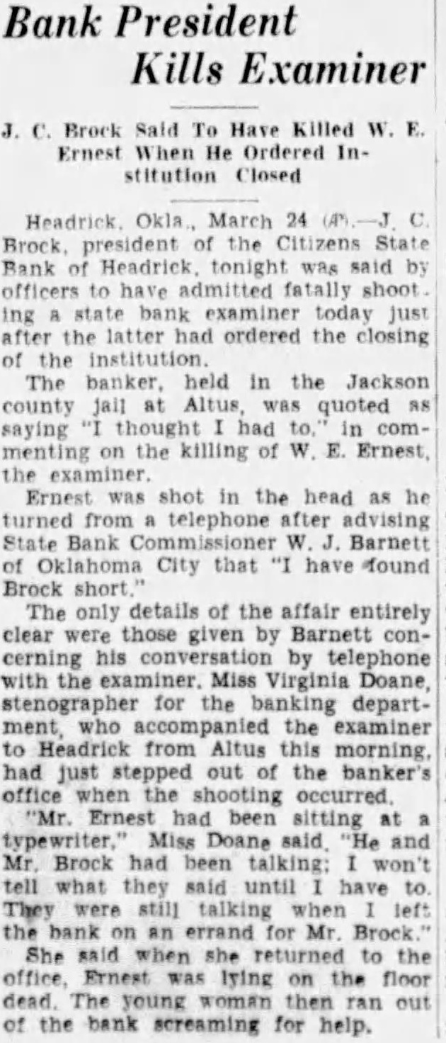 Bank President Kills Examiner Brock Said To Have Killed Ernest When He Ordered Institution Closed March 24 the Bank Headrick tonight by officers to admitted fatally shoot examiner today after ordered the closing The banker. in the Jackson county Altus quoted saying thought had menting the killing E. Ernest the Ernest was shot in the head as he turned from telephone advising State Bank Barnett City that have found Brock only details the affair entirely clear given by Barnett concerning his telephone with the Miss Virginia Doane, stenographer for the banking department, who accompanied the examiner to Headrick from Altus this had just out banker's office the been sitting Brock had been tell what they until have They still talking left bank on errand for Mr. Brock She said when returned to the Ernest lying on the The then of the bank screaming for help.