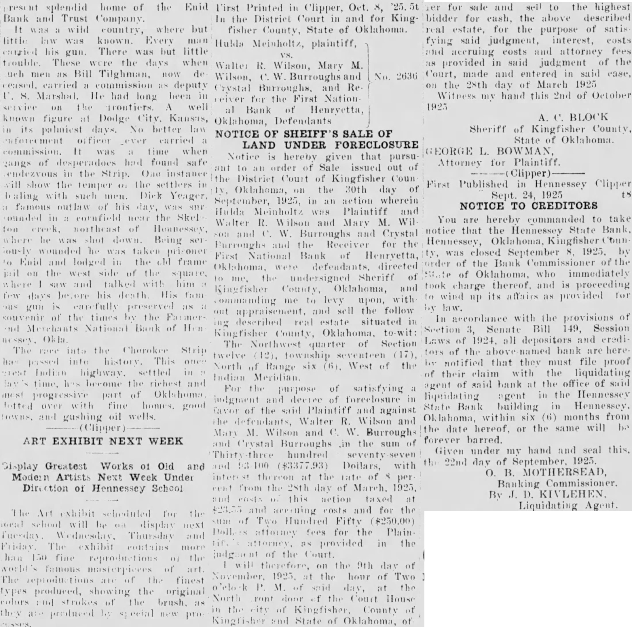 resent splendid home of the Enid was wild country where but law was Every man trouble These were the days when men Bill Tilghman, now de earried commission as deputy S. Marshal He had long been in service the A well its palmiest days. No better law commission. It was time when gangs of had found safe in the Strip. Dae instance ill show the temper the settlers in lealing with such men. Dick Yeager, famous outlaw of his day ounded cornfield near the Skel where he was down Being ser ously wounded he was taken pri oner Enid and lodged in the old frame jail on the west side of the square, where saw and talked with him few days before his death His from souvenir of the times by the Farmer and Merchants National Bank of Hen Okla The into the Cherokee Strip has passed into history This onee creat Indian highway settled in time, become the richest and most progressive part of Oklahoma fine good towns, and gushing oil wells. (Clipper) First Printed in Clipper, Oct. 8, '25 5t In the District Court in and for Kingfisher County, State of Oklahoma. Hulda plaintiff, No. Walter R. Wilson, Mary M. Wilson, W Burroughs and Crystal Burroughs, and Re reiver for the First Nation al Bank of NOTICE OF SHEIFF SALE OF LAND UNDER FORECLOSURE Notice is hereby given that pursu ant to an order of Sale issued out of the District Court of Kingfisher Coun ty, Oklahoma, on the 30th day of September, 1925. in an action wherein Hulda Meinholtz was Plaintiff and Walter R. ilson and Mary M. Will son and W Burroughs and Crystal Burroughs and the Receiver for the First National Bank of Henryetta the undersigned Sheriff of Kingfisher County Oklahoma, and commanding me to levy upon, with out appraisement. and sell the follow described real estate situated in Kingfisher County, to-wit: The Northwest quarter of Section twelve (12), township seventeen (17), North of Range six (6). West of the Indian Meridian For the purpose of satisfying indgment and decree of favor of the said Plaintiff and against the Walter R. Wilson and and Crystal Burroughs the sum of three hundred seventy seven and 03 100 ($3377.93) Dollars, with at the rate of per cent from the 28th day of March. 1925. and this action taxed at sum of Two Hundred Fifty $250.00) Doll attorney fees for the Plain fif attorney, provided in the judg of the Court will therefore, on the 9th day of November, 1925, at the hour of Two o'elock M. of said day, at the North ront door of the Court House in the city of Kingfisher, County of Kingfisher and State of Oklahoma, of for sale and sell to the highest bidder for cash, the above described real estate, for the purpose of satis fying said judgment, interest, costs and accruing costs and attorney fees RS provided in said judgment of the 2636 Court, made and entered in said case, on the 28th day of March 1925 Witness my hand this 2nd of October 1925 A. BLOCK Sheriff of Kingfisher County, State of Oklahoma GEORGE L. BOWMAN, Attorney for Plaintiff. Clipper) First Published in Hennessey Clipper 24 1925 NOTICE TO CREDITORS You are hereby commanded to take notice that the Hennessey State Bank, ty, was closed September 1925, by order of the Bank Commissioner of the of Oklahoma, who immediately took charge and is proceeding to wind its affairs as provided for by law. In accordance with the provisions of Section 3, Senate Bill 149, Session Laws of 1924, all depositors and credit tors of the above named bank are here be notified that they must file proof of their claim with the liquidating agent of anid bank at the office of said liquidating agent in the Hennessey State Bank building in Hennessey. within six (6) months from forever barred. Given under my hand and seal this, the 22nd day of September, 1925. O. B. MOTHERSEAD. Banking Commissioner. By J. D. KIVLEHEN Liquidating Agent.