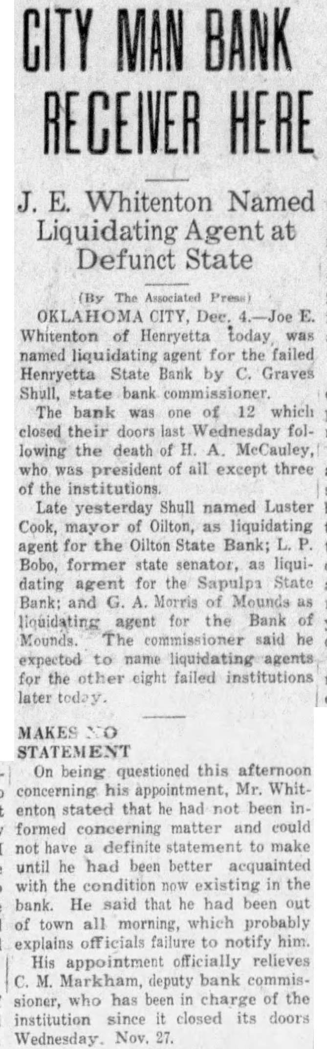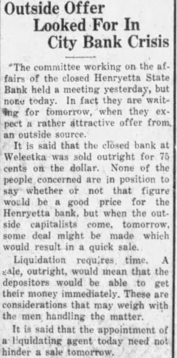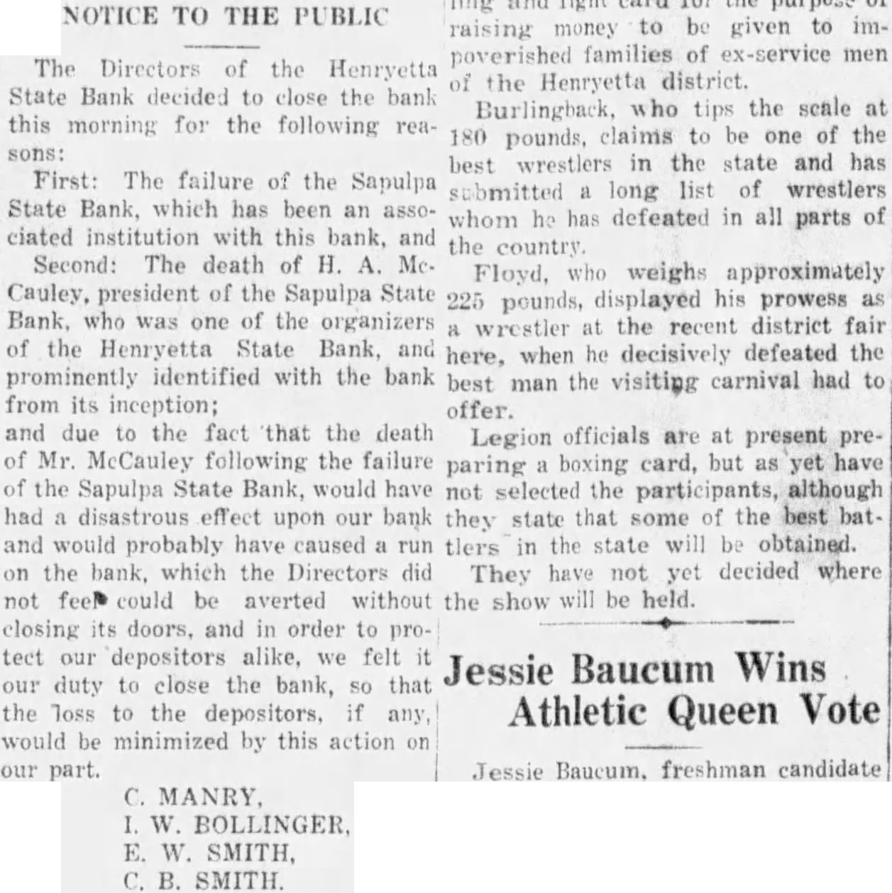 NOTICE TO THE PUBLIC poverished The Directors of the Henryetta of the Henryetta district. State Bank decided to close the bank Burlingback, who tips the scale at this morning for the following rea 180 pounds, claims to be one of the sons: best wrestlers in the state and has First: The failure of the Sapulpa submitted long list of wrestlers State which has been an whom he has defeated in all parts of ciated institution with this bank, and the Second: The death of H. A. Mcwho weighs approximately Cauley, president of the Sapulpa State 225 pounds, displayed his prowess as Bank, who was one of the organizers wrestler the recent district fair of the Henryetta State Bank, and the here, when he decisively defeated prominently identified with the bank carnival had best man the visiting to from its inception; offer. and due to the fact that the death officials at Legion are present preof Mr. McCauley following the failure boxing card, but have paring as of the Sapulpa State Bank, would have not selected the although had disastrous effect upon our bank that some of the best batthey state and would probably have caused run tlers in the state will be obtained. on the which the Directors did They have not yet decided where not could be averted without the show will be held. closing its doors, and in order to protect our depositors we felt Jessie Baucum Wins our duty to close the bank, that the loss to the depositors, if any, Athletic Queen Vote would be minimized by this action our part. Jessie Baucum. freshman candidate C. MANRY E. W. SMITH, SMITH.