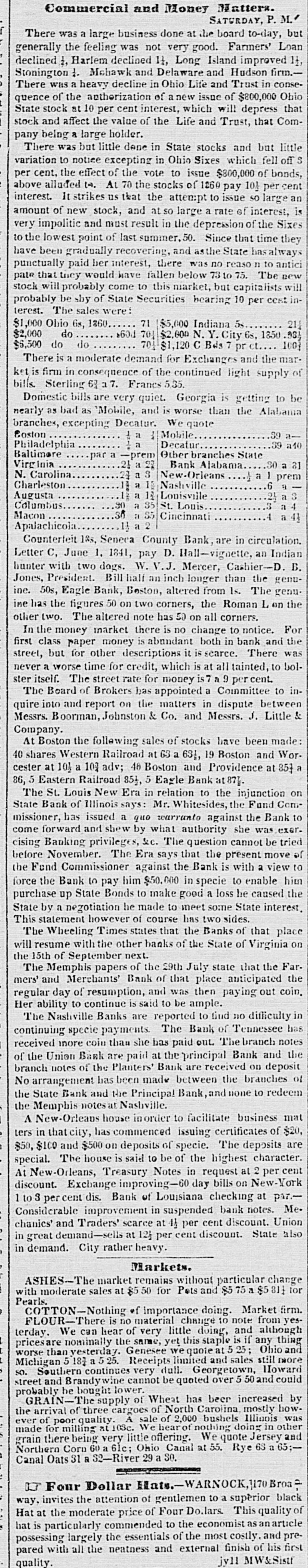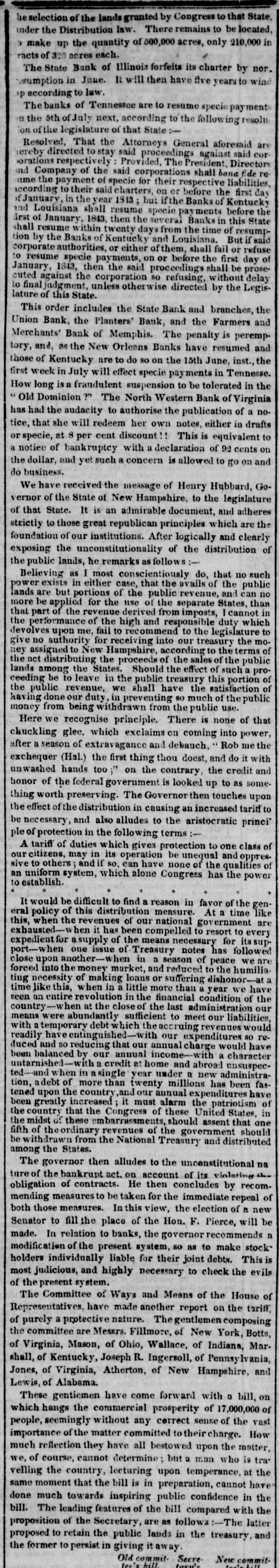 # BANK CONVENTION. At meeting of the delegates from the Banks of Mississippi and Tennessee, convened at the Commercial & Rail Road Bank of Vicksburg, the following Banks were represented, viz: Farmers & Mechanics Bank of Memphis; Planters Bank, Natchez; Agricultural Bank, Commercial & Rail Road Bank of Vicksburg, West Feliciana Rad Road & Banking Company, Commercial Bank of Natchez, Commercial Bank of Manchester, Commercial Bank of Rodney, Bank of Lexington, Vicksburg Waterworks & Banking Company, Mississippi Rail Road Company, Citizens Bank of Madison County, Mississippi Union Bank, Real Estate Banking Company of Hinds County, Bank of Vicksburg. On motion, H G Runnels was called to the Chair, and J J Chewning was appointed Secretary. On motion, Resolved, That Messers. J Wood and George G Skipwith of Nashville, be invited to take a seat in this Convention. The following resolutions was offered by Stephen Duncan: Resolved, That the first monday in January next be the period fixed on for a resumption of specie payments by the Banks represented in this Convention; provided the delegates from the Union Bank of Mississippi will give assurance that the post notes of that Bank will be redeemed with specie, or its equivalent, when presented at her counter. On motion to strike out all after the word "provided," the yeas and nays being called, the vote stood thus; Ayes. E Montgon.ery, of Planters Bank; M B Irmer, Commercial Bank of Manchester; J C Bole, Lexington Bank; S P Webster, Vicksburg W W & Banking Co; J A Quitman, Miss. R R Co; W Hardeman, Citizens Bank of Madison county; H G Runnels and R M Williamson, Mississippi Union Bank. Nays-E W Lucas, of Famers and Mechanics Bank, Memphis; S Duncan, Agricultural Bank, J J Chewning, Com. & R R Bank of Vicksburg; G H Gordon, West Feliciana R R & Banking Co; L R Marshall, Com. Bank of Natchez; Thos. Freeland, Com, Bank of Rodney; A M Paxton, Bank of Vicksburg. This being a tie, the motion was lost. S P Webster proposed to strike out all the above resolutions, after the word "resolved," and proposed the following as a substitute: Whereas, in the opinion of this Convention, a resumption of specie payments by the Banks of Mississippi on the first day of January next, would be prejudicial to the interest of the community, for the following, among other reasons: 1. Because the month of January is the middle of the business season, and the period of the year when both planter and merchant stand in most need of all the bank facilities which can be afforded them. 2. Because it is the season of the year at which the largest amount of engagements have usually been made to fall due, and causes the months of January and February, in ordinary times, to be seasons of peculiar pressure in the money market. 3. Because the engagements maturing in January and February have, to a considerable extent, been passed to foreign creditors, and would immediately be demanded in specie or Eastern exchange. 4. Because of the present high rate of exchange against this state, in which condition a resumption of specie payments is unprecedented in any state of nation. The recent resumption in New York not being made until exchange had been for a period of two months in their favor, and in Philadelphia not until five months after that condition of things existed and at a time when the importation of specie by the banks of those places was a business of profit. 5. Because a resumption in January would cause the whole bank note circulation of the State to come in upon the banks, and leave the state without a circulating medium at all, to the great detriment of trade, and to the utter ruin of all who have money to pay at our spring courts, or provisions to purchase for the coming season. 6. Because it would be a burden of from 2 to 5 percent. of their whole circulation, upon the resuming banks without corresponding benefit to any class of persons, other than the Northen holders of our circulation, who have purchased it on speculation at from 15 to 40 percent discount.