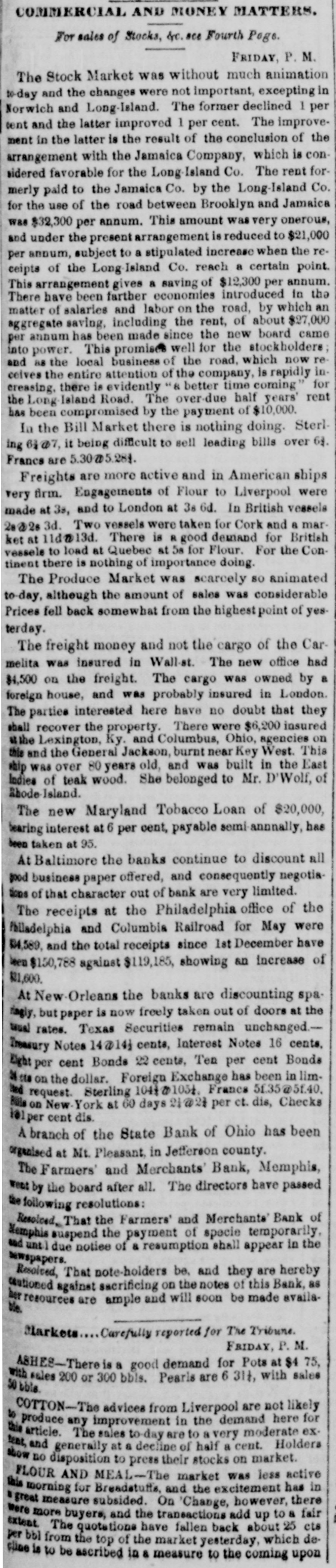 COMMERCIAL AND MONEY MATTERS. For Sales of Stocks. sc see Fourch Page MONDAY P M. There was continuation to-day of the reaction the of Saturday afternoon in the Stock market, and Fancles were all buoyant. At the Second Board, bow. ever, prices again receded little. The Fancies are now at such point that the shorts come in at every appearance of rally, and thus the market is kept fluctuating The sound stocks were steady. and in fair demand. The business in Exchange for the French Steamer was not large, and rates are without change.- with Sterling is 9@9 nominally France 5 23105 22, fair supply The Steamer took about $60,000 in French silver. To Freights there is little or nothing doing. Liverpool In rates continue to be for Cotton, goods 6d for Grain, and 18d for Flour; 25.@30 for heavy To Havre the packet is full atte for Cotton In Uncurrent Money there is considerable activi- the ty but the demand is good for currency and takes all redemptions again. The activity of business in the departments employe all the circulation which Banks are entitled to. Money continues abundantly easy for all busipurposes. The Banks will be somewhat stringent until ness next week. but there is no difficulty in negotiating loans in the street at 5@7 per cent according to security de The Eagle Fire Insurance Company have of clared dividend of per cent payable on the 1st November The Boston Courier has published several able articles our relations with Brazil, from the pen of upon late Consul in which the great G.W. Gordon, Erq. our the dan value of our commerce with that country. and India ger of Interruptions! which It is exposed by the Wise.eretion-to epeak in the mildest term-of Mr. Brazil takes very large amount of our Breadstuffs and the manufactures annually, and the trade between countries being done almost exclusively to American bottoms, employs very large amount of American Mr ton nage, and of course large number of our seamen Gordon truly says: This commerce is too important to our The best Adminis interests be trided with by our Government. Mexican tration to already rode its hobby-horse when they first much farther than they expected should thrust upon It it time that they quent wisdom from experience, and consee ly examine well the ground before they take for the any people step Brazila: the with embroil United which may States will hold them fearful respon the If. in addition to the Mexican war, our comability merce destroyed or interrupted with the Brazile rela We how soon our peaceful commercial things that country may be placed among de tions exist The event which no longer that action of our Government for unless pends the Government obtain from the Administra the Brazilian Washington the satisfaction which con tion with that country plomatic be relations interrupted. to the great detriment of our in vinced. commerce which cannot exist or be carried on troubled waters. The extent and value of our commerce with Brazil is shown from the official reports Flour. In the fiscal year 1844-5, we exported to country 209,845 bble valued $1,083,318 being about one-fifth of our total exporto est article all countries and in 1845-6, Brazils took 296,460 bbla. valued at $1,675,756, belog very large Increase over the preceding year. The consumption of Flour in the Brazilamus naturally increase and with the population. which is new about 10,000,000, of which is Increasing rapidly. Of our manufactures 1844-5 exported to the Brazile to the amount $830,926 being about of our total port to countries. To our navigation interests our commerce the Brazile is truly of great importance. it being carried on almost entirely in American vessels. la 1844-5, not a single Brazilian vessel entered the United States during that fiscal year the foreign vessels which arrived in this country from the Brazile were 2 British, Swedish, 2 Danish and Sardinian, tonuaging 2,481 there were during that period 214 Ame rican vessels, navigated with 2,198 men and 40 boys, and tonnaging 50,230 tons. which entered the United States from the Brazile: and during the same year 192 American vessele navigated with men and 23 boys, and tonnaging 40,716 tons. cleared from this country, only small Brazilian vessel of 191 tons. navigated with 14 men, and British, Sardinian, 2 Hansestle, Spanish, and Hanoverian vessel. tonuaging in all 2,077 tons, including the Brazilian vessel. cleared from the United States for the ports of Brazil. The Austrians are in making great exertions to compete with us in Brazil Flour. and do already come in direct competition. From Trieste Flour is obtained as good as the American and labor to Austria is cheaper than in America. and the Austrian vessels are navigated cheaper, it is highly in portant the United States should be on the terms of the most favored nations with Brazil, as any commercial advantage given to Austria would destroy the American trade. The same effect would follow in re gard to manufacturers, from an advantage given to Eng land. Ualess our relations with this country are man aged with great prudence and in conciliatory spirit, we shall be very likely to lose the advantages of a commer cial treaty, placing us on an equal footing with other D& tions Our true polley to cultivate a friendly under standing with the growing nations of South America, and we trust Mr Polk and his Cabinet will not act rash ly in this matter. The people will scareely tolerate another war. At the meeting of the stockholders of the Har lem Railroad Company held at the Astor House, a Com mittee was appointed* consisting of Messro J H. D kers, Jacob Little D.S. Miller, H. Schuyler. and Jona. Stur. gas devise feasible plan for extricating the Company from its present embarraasments, and report the same to the stockholders on Thursday evening next. The report of the suspended Farmers' and Mechanica' Bank of Memphis, has been made and the Directors state that it is impossible in any event that the creditors anything. They pronounce 