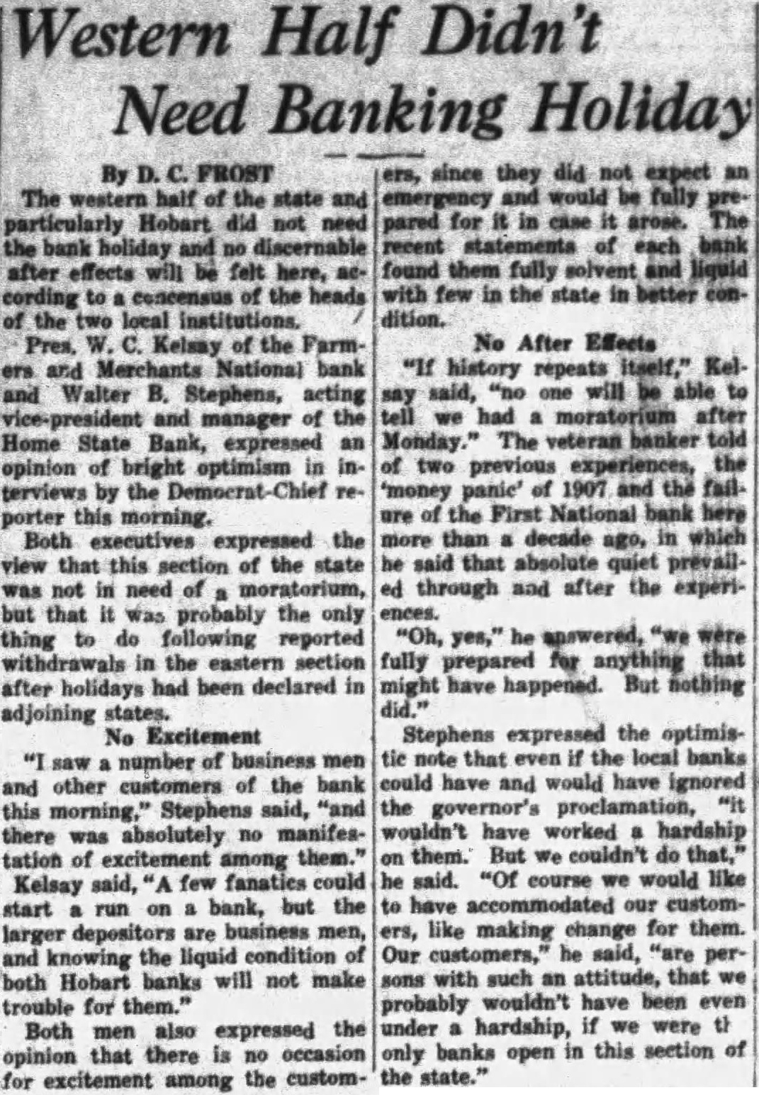 Western Half Didn't Need Banking Holiday By The half the state particularly Hobart did not need holiday and no discernable after effects will be felt here, according of the heads local institutions. Pres. Kelsay of the Farmand Merchants National bank Walter B. Stephens, acting and of the Home State Bank, expressed an opinion of bright optimism in interviews by the porter this morning. Both executives expressed the view that this section of the state not in need of moratorium, but that was probably the only thing to do following reported withdrawals in the eastern section after holidays had been declared in adjoining states. No Excitement saw number of business men and other customers of the bank this morning," Stephens said, there was absolutely no manifestation of excitement among them." said, few fanaties could Kelsay bank, but the start run on larger depositors are business men, and the liquid condition of knowing both Hobart banks will not make trouble for them." Both men also expressed the opinion that there is no occasion for excitement among the custom- since they did not expect and would be fully pared for in case it arose. The recent statements of each bank found them fully solvent and with few in the state in better dition. No After Effects history repeats Kelsaid, "no one will be able we had moratorium after Monday." The veteran banker told two previous experiences, the 'money panic' of 1907 and the failof the First National bank here more than decade ago, in which he said that absolute quiet through and after the experiences. answered, were fully prepared for anything that might have happened. But nothing Stephens expressed the optimistie note that even if the local banks could have and would have ignored the governor's proclamation, wouldn't have worked a hardship them. But We couldn't do said. "Of course we would like have accommodated our customlike making change for them. Our customers," he said, "are persons with such an attitude, that we probably wouldn't have been even under hardship, if were banks in this section of only open the