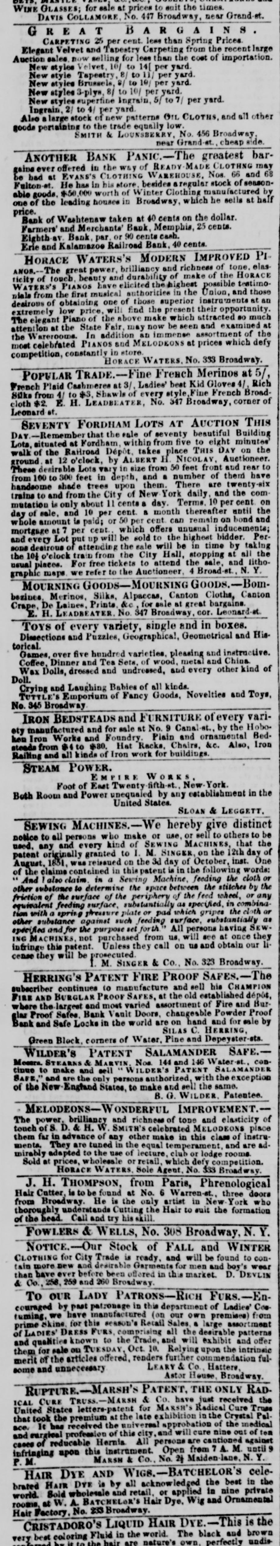 WINE GLASSES; for sale at prices to suit the times. DAVIS COLLAMORE, No. 447 Broadway, near GrandGREAT B A R G A I N CARPETING 25 per cent. less than Spring Prices Elegant Velvet and Tapestry Carpeting from the recentlarge Auction sales, now selling for less than the cost of importation. New styles Velvet, 10/ to 14[ per yard. New style Tapestry 8/ to 11/ per yard. New styles Brussels, 8/ to 10/ per yard. New styles 3-plys, 8/ to 10/ per yard. New styles superfine Ingrain, 5/ to 7/ per yard. Ingrain, 2/ to 4/ per yard. Also large stock of new patterns OIL CLOTHS, and all other goods pertaining to the trade equally low. SMITH & LOUNSBERRY, No. 456 Broadway near Grand-st. cheap side. ANOTHER BANK PANIC.-The greatest bargains ever offered in the way of READY MADE CLOTHNG may be had at EVANS'S CLOTHING WAREHOUSE, Nos. 66 and 68 Fulton-st. He has in his store. besides aregular stock of seasonable goods, $50 000 worth of Winter Clothing manufactured by one of the leading houses in Broadway, which he sells at half price. Bank of Washtenaw taken at 40 cents on the dollar. Farmers' and Merchants' Bank, Memphis, 25 cents. Eighth av Bank, par. or 90 cents cash. Erie and Kalamazoe Railroad Bank. 40 cents. HORACE WATERS'S MODERN IMPROVED PI ANOS.--The great power, brilliancy and richness of tone. elasticity of touch beauty and durability of make of the HORACE WATERS'S PIANOS have elicited the highest possible testimonials from the first musical authorities in the Union, and those desirous of obtaining one of those superior instruments at an extremely low price, will find the present their opportunity. The elegant Piano of the above make which attracted so much attention at the State Fair, may now be seen and examined at the Warerooms. In addition an immense assortment of the most celebrated PIANOS and MELODEONS at prices which defy competition, constantly in store. HORACE WATERS. No. 333 Broadway. POPULAR TRADE.-Fine French Merinos at 5/, French Plaid Cashmeres at Ladies' best Kid Gloves 4/, Rich Silks from 4/ to $3. Shawls of every style Fine French Broadcloth $2. E. H. LEADBEATER, No. 347 Broadway, corner of Leonard et. SEVENTY FORDHAM LOTS AT AUCTION THIS DAY.-Remember that the sale of seventy beautiful Building Lots, situated at Fordham, within from five to eight minutes walk of the Railroad Dépôt, takes place THIS DAY on the ground at 12 o'clock, by ALBERT H. NICOLAY, Auctioneer. These desirable Lots vary in size from 50 feet front and rear to from 100 to 300 feet in depth, and a number of them have handsome shade trees upon them. There are twenty-six trains to and from the City of New York daily, and the commutation is only about 11 cents a day. Terms. 10 per cent on day of sale. and 10 per cent. a month thereafter antil the whole amount is paid; or 50 per cent. can remain on bond and mortgage at 7 per cent. which offers unusual inducements; and every Lot put up will be sold to the highest bidder. Persons desirous of attending the sale will be in time by taking the 104 o'clock train from the City Hall, stopping at all the usual places. For free tickets to attend the sale, and lithographic maps. we refer to the Auctioneer, 4 Broad-st., Y. MOURNING Goods-Mourning Goods.-Bombezines, Merinos, Silks, Alpaccas, Canton Cloths, Canton Crape, De Laines, Prints. &c for sale at great bargains. E. H. LEADBEATER. No. 347 Broadway, cor. Leonard-st Toys of every variety, single and in boxes. Disections and Puzzles, Geographical, Geometrical and Historical. Games, over five hundred varieties, pleasing and instructive. Coffee, Dinner and Tea Sets. of wood, metal and China Wax Dolls, dressed and undressed, and every other kind of Doll. Crying and Laughing Babies of all kinds. TUTTLE'S Emporium of Fancy Goods, Novelties and Toys, No. 345 Broadway IRON BEDSTEADS and FURNITURE of every variety manufactured and for sale at No. 9 Canal by the Hobohen Iron Works and Foundry Plain and ornamental Bedsteads from $1 to $80. Hat Racks. Chairs, &c. Also, Iron Railing and all kinds of Iron work for buildings. STEAM POWER. EMPIRE WORKS Foot of East Twenty fifth-st., New York. Both Room and Power unequaled by any establishment in the United States. SLOAN & LEGGETT. SEWING MACHINES.-We hereby give distinct notice to all persons who make or use, or sell to others to be used, any and every kind of SEWING MACHINES, that the patent originally granted to I. M. SINGER, on the 12th day of August, 1851, reissued on the 3d day of October, inst. One of the claims contained in this patent is in the following words: And also claim in a Sewing Machine, feeding the cloth or other substance to determine the space between the stitches by the friction of the surface of the periphery of the feed wheel, or any equivalent feeding surface, substantially as specified, in combina tion with a spring pressure plate or pad which gripes the cloth or other substance against such feeding surface, substantially as spécified and the purpose set All persons having SEW. ING MACHINES. not purchased from us, will #00 at once they infringe this patent. Unless they call on us and obtain our license they will be prosecuted. M. SINGER & Co., No. 323 Broadway. HERRING'S PATENT FIRE PROOF SAFES.-The subscriber continues to manufacture and sell his CHAMPION FIRE AND BURGLAR PROOF SAFES, at the old established dépôt, where the largest and most varied assortment of Fire and Burglaz Proof Safes. Bank Vault Doors, changeable Powder Proof Bank and Safe Locks in the world are on hand and for sale by C. SILAS HERRING, Green Block, corners of Water. Pine and Depeyster-sts. WILDER'S PATENT SALAMANDER SAFE.Messra. STEARNS & MARVIN. Nos. 144 and 146 Water-st., continue to make and sell WILDER'S PATENT SALAMANDER SAFE," and are the only persons authorized, with the exception of the New-Engfand States, to make and sell the same. B. G. WILDER. Patentee. MELODEONS-WONDERFUL IMPROVEMENT.The power, brilliancy and richness of tone and elasticity of touch of S. D. & H. W. SMITH'S ce
