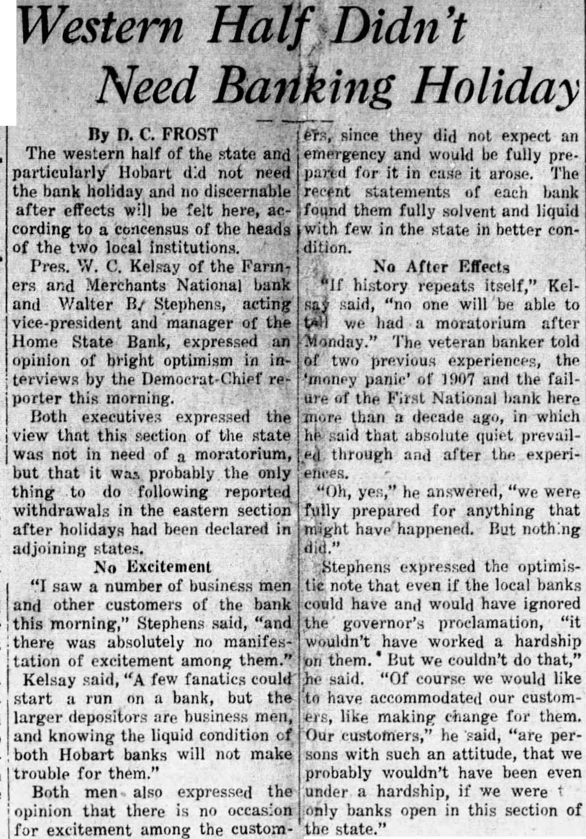 Western Banking Holiday By The western half of the state and particularly Hobart not need the holiday no discernable after effects will be felt here, according concensus of the heads the two local institutions. Pres. Kelsay of the Farmand Merchants National bank and Walter B/ Stephens, acting and manager of the Home State Bank, expressed opinion of bright optimism in terviews by the porter this Both executives expressed the view that this section of the state not in need of moratorium, but that was probably the only thing to following reported withdrawals in the eastern section after holidays had been declared adjoining states. No Excitement saw number of business and other customers of the morning,' Stephens said, there was absolutely manifestation of excitement among Kelsay said, few fanatics could start bank, but the larger men, and knowing the liquid condition both Hobart banks will not make trouble for Both also expressed the opinion that there is occasion excitement among the custom- they expect and would be fully pared for in arose. The statements each bank found them fully solvent and liquid with few in the state in better condition. No After Effects history repeats said, one will be able moratorium after The veteran banker told two previous experiences, the panic' of 1907 and the failthe First National bank here than decade which that absolute quiet prevailthrough and after the answered, were fully prepared for anything that might But Stephens expressed the optimisthat if the local banks could have and would have ignored governor's wouldn't have worked hardship them. couldn't do said. course we would like have accommodated our customlike making change for them. customers,' said, such an attitude, that probably wouldn't have been even under hardship, banks in this section of open
