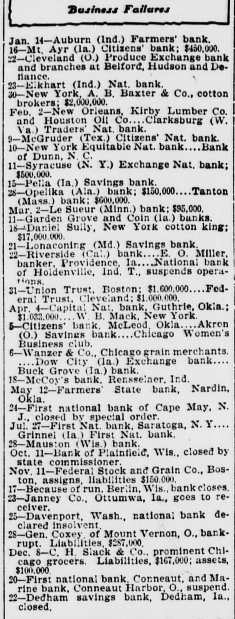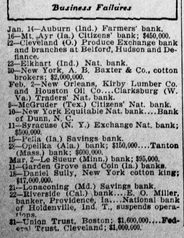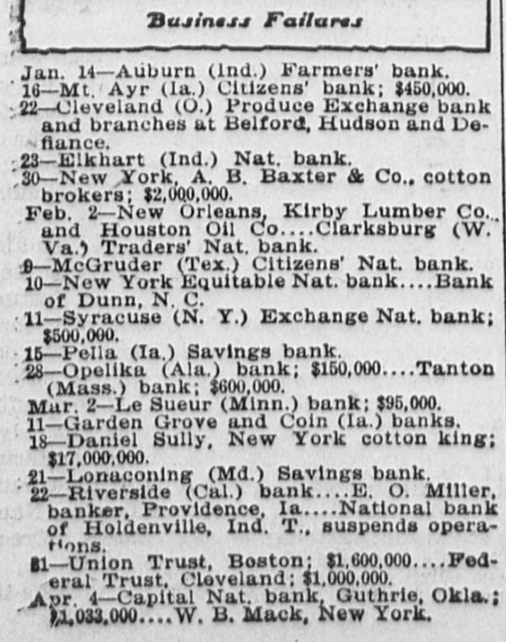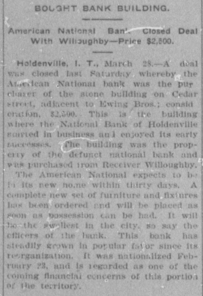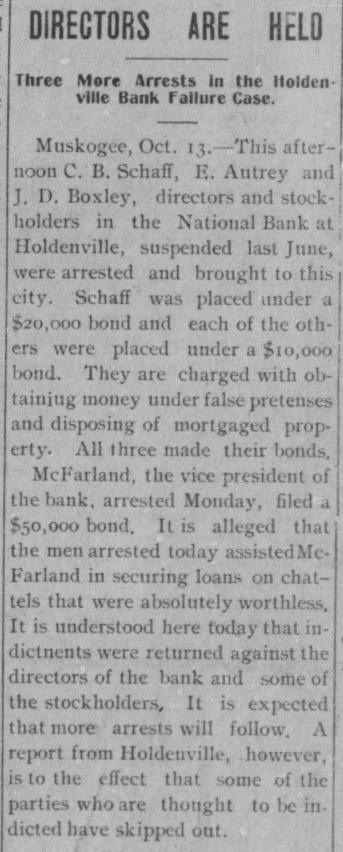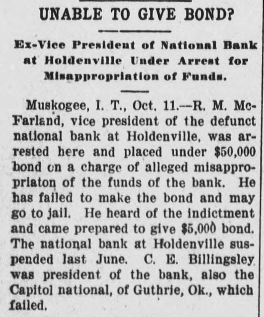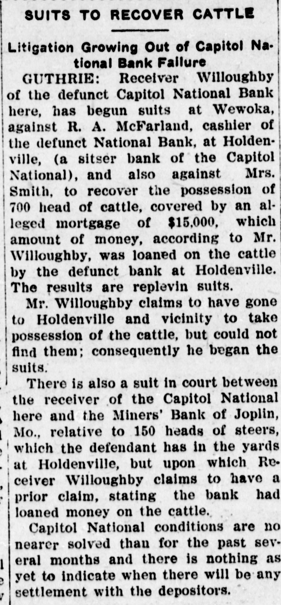 SUITS To RECOVER CATTLE Litigation Growing Out of Capitol National Bank Failure GUTHRIE: Receiver Willoughby of the defunct Capitol National Bank here, has begun suits at Wewoka, against R. A. McFarland, cashier of the defunct National Bank, at Holdenville, (a sitser bank of the Capitol National), and also against Mrs. Smith, to recover the possession of 700 head of cattle, covered by an alleged mortgage of $15,000, which amount of money, according to Mr. Willoughby, was loaned on the cattle by the defunct bank at Holdenville. The results are replevin suits. Mr. Willoughby claims to have gone to Holdenville and vicinity to take possession of the cattle, but could not find them; consequently he began the suits. There is also a suit in court between the receiver of the Capitol National here and the Miners' Bank of Joplin, Mo., relative to 150 heads of steers, which the defendant has in the yards at Holdenville, but upon which Receiver Willoughby claims to have a prior claim, stating the bank had loaned money on the cattle. Capitol National conditions are no nearer solved than for the past several months and there is nothing as yet to indicate when there will be any settlement with the depositors.