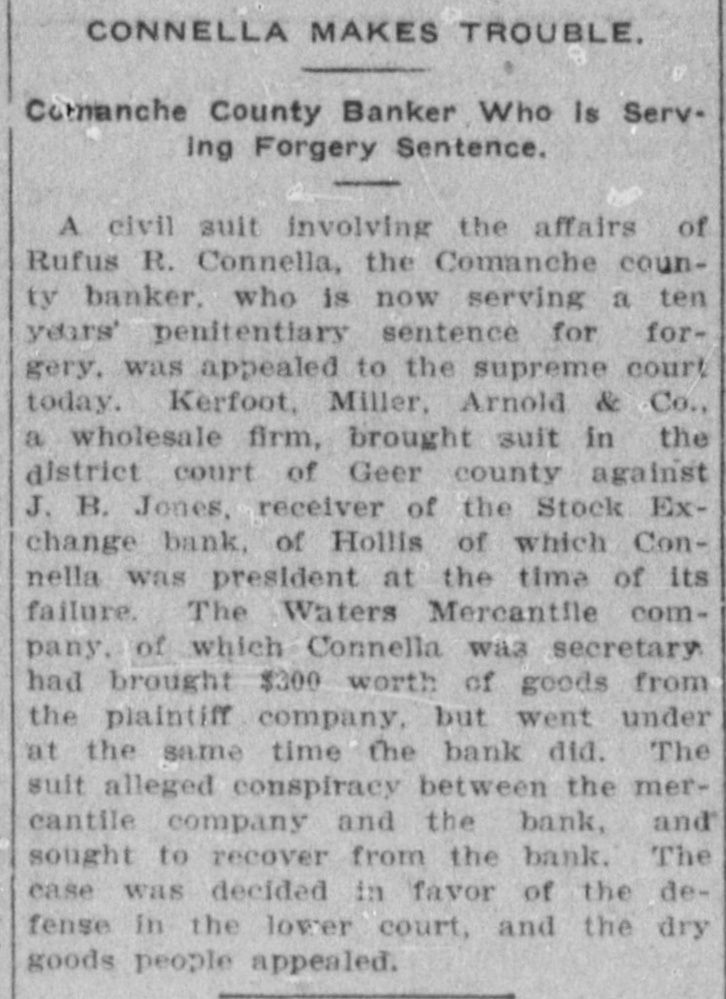 CONNELLA MAKES TROUBLE. Comanche County Banker Who is Serving Forgery Sentence. A civil suit involving the affairs of Rufus R. Connella, the Comanche county banker. who is now serving a ten years' penitentiary sentence for forgery. was appealed to the supreme court today. Kerfoot, Miller, Arnold & Co., a wholesale firm, brought suit in the district court of Geer county against J. B. Jones, receiver of the Stock Exchange bank. of Hollis of which Connella was president at the time of its failure. The Waters Mercantile company. of which Connella was secretary had brought $300 worth of goods from the plaintiff company, but went under at the same time the bank did. The suit alleged conspiracy between the mercantile company and the bank, and sought to recover from the bank. The case was decided in favor of the defense in the lover court, and the dry goods people appealed.