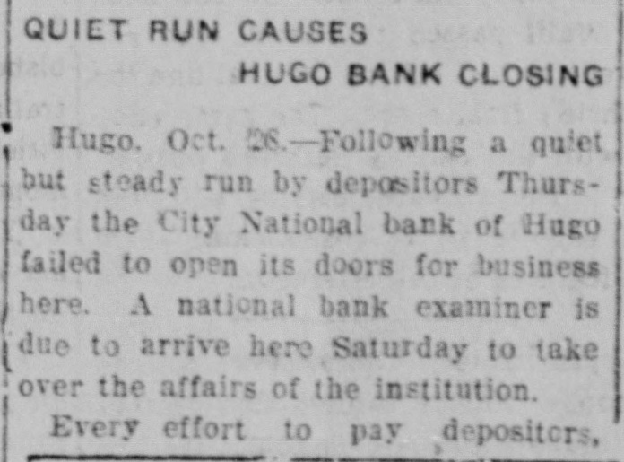 QUIET RUN CAUSES HUGO BANK CLOSING Hugo. Oct. 28.-Following a quiet but steady run by depositors Thursday the City National bank of Hugo failed to open its doors for business here. A national bank examiner is due to arrive here Saturday to take over the affairs of the institution. Every effort to pay depositors,