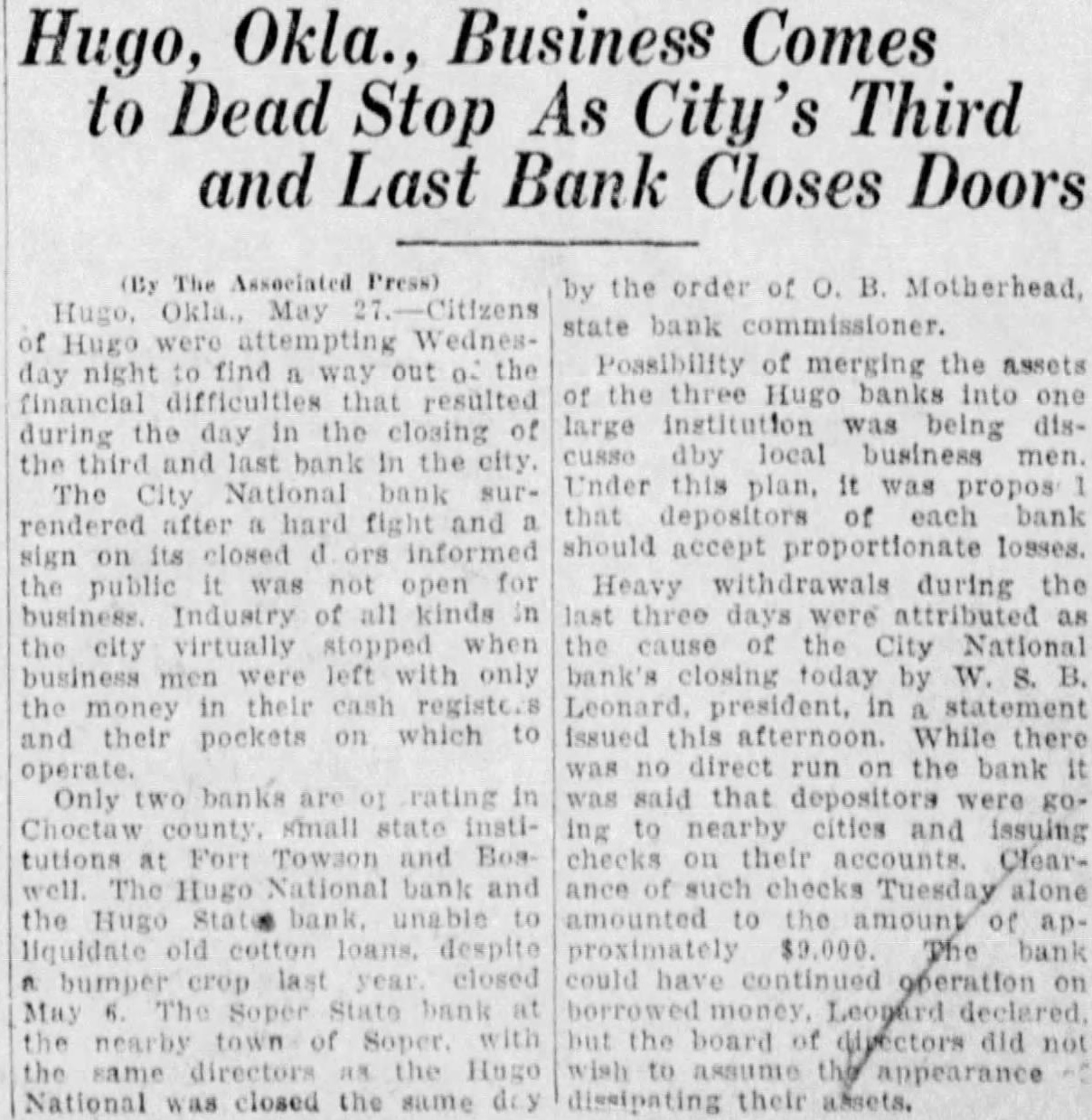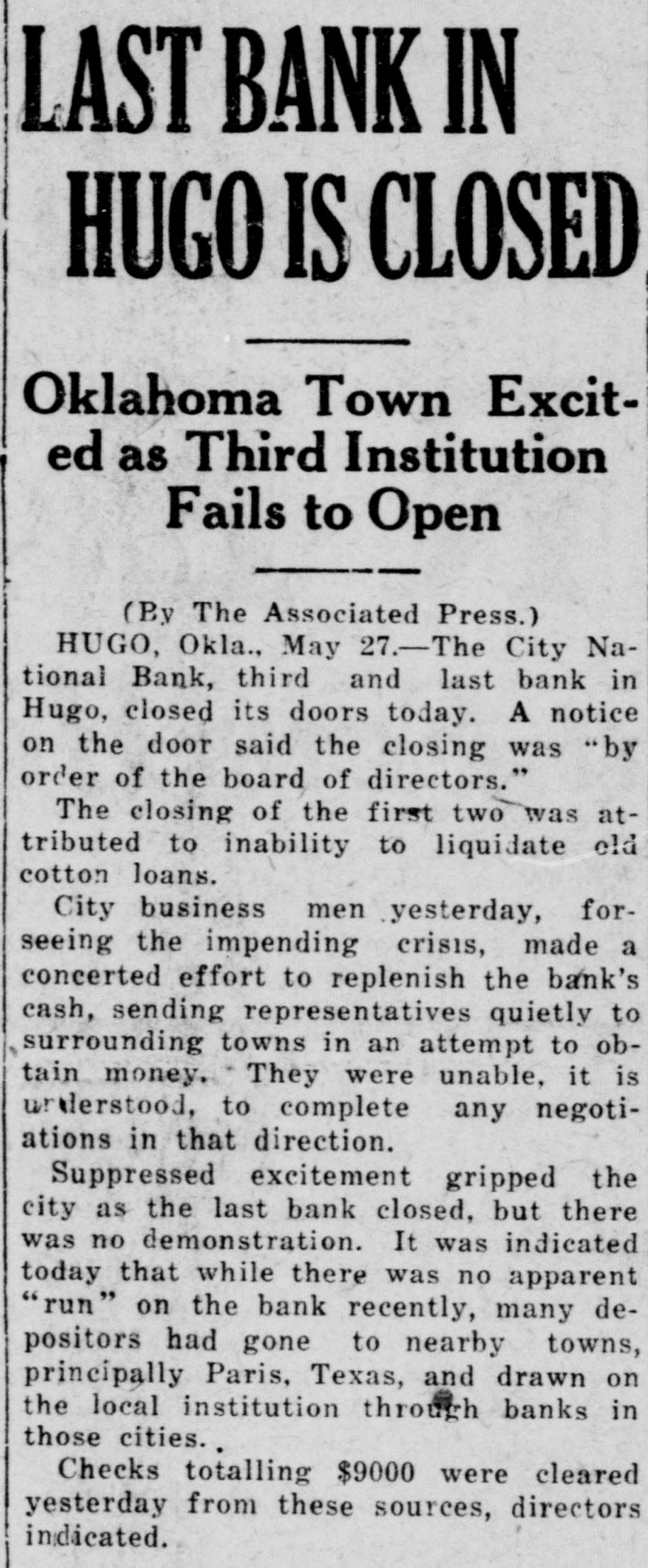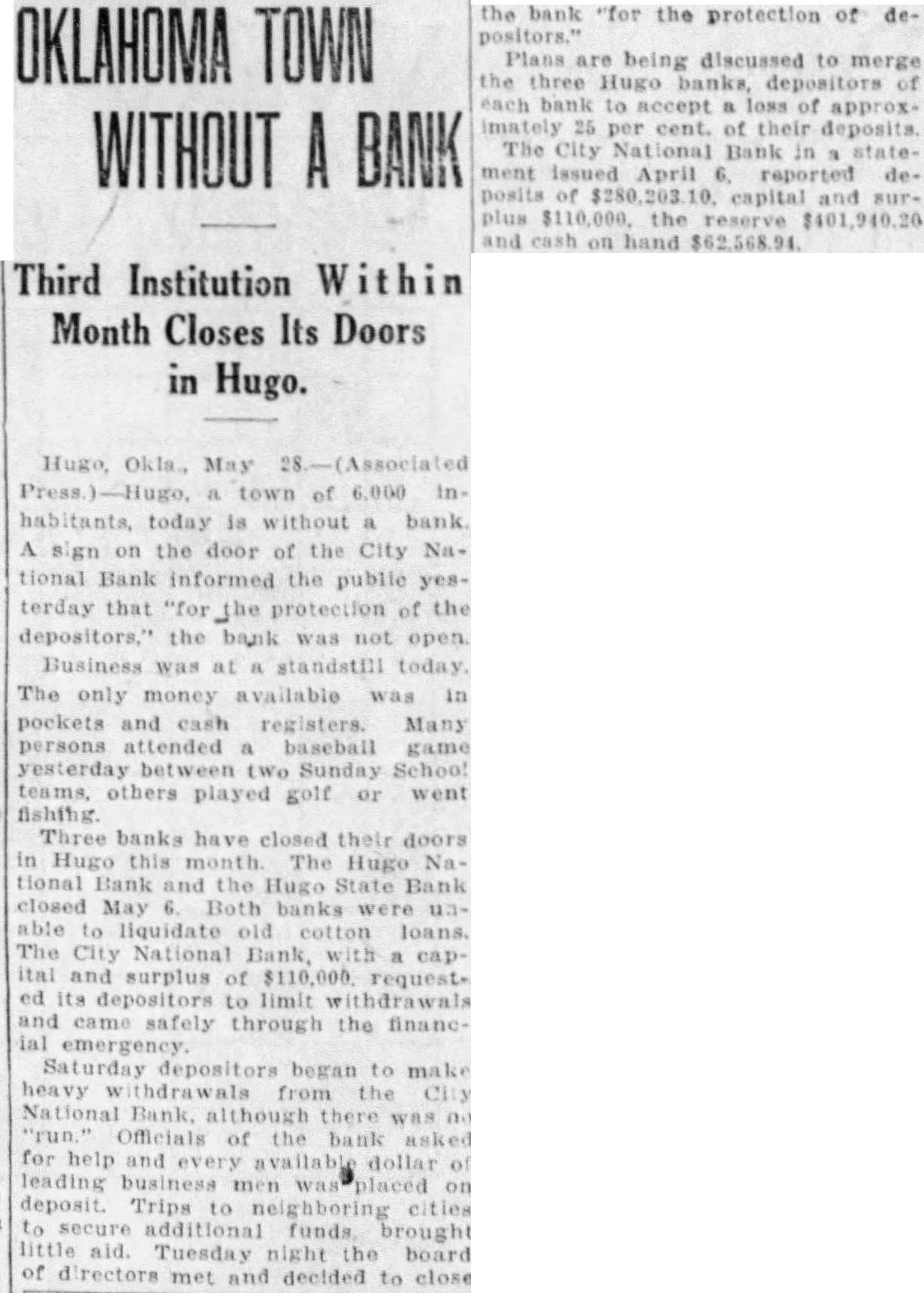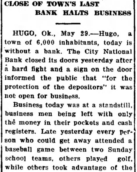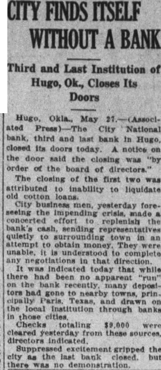 The City National Bank of Hugo, Oklahoma, closed its doors by order of its board of directors Wednesday morning of this week. It was the last of Hugo's banks, the First National, of that city, and the Hugo State Bank, having closed earlier this month. It leaves Hugo, which city of 6,000 people, and the county seat of Choctaw county, without bank of any kind. In fact, there are but two small banks left in the county; one at Fort Townsen, the other Boswell. The reason for the closing of the City National was, that depositors in it went to other towns and cities in Oklahoma and Texas, and drew checks on it, in that manner withdrawing in singal day. The officers feared run SO ordered the bank closed.