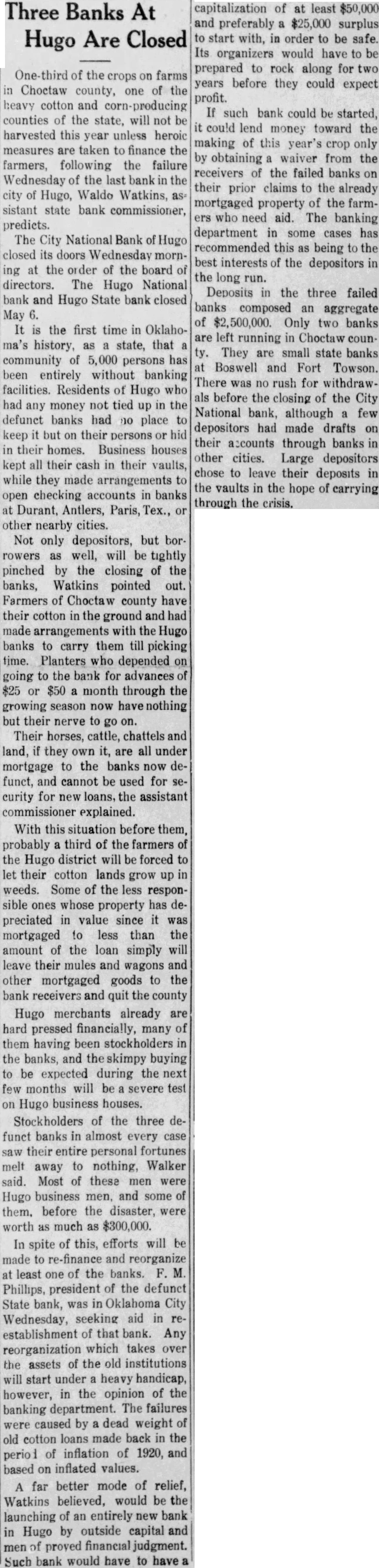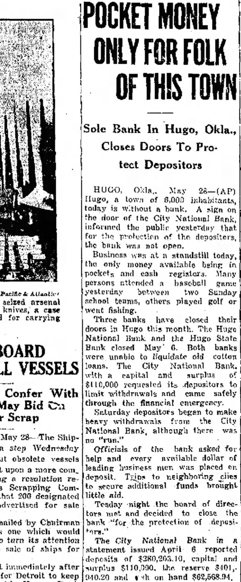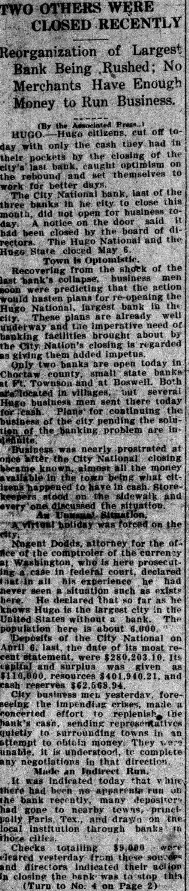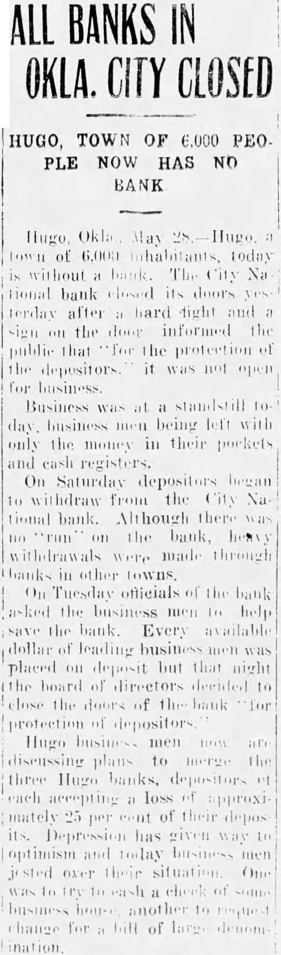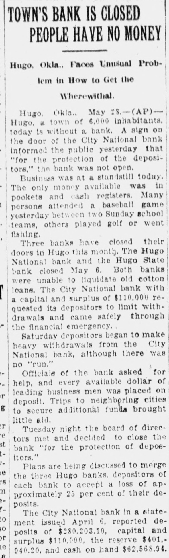 May Hugo, a town of 6,000 inhabitants, today is without bank. A sign on the door of the City National Bank, informed the public yesterday that for the protection of the depositers, the bank was not open. Business WHS at standstill today, the only money available being in pockets and eash registers. Many persons attended baseball game yesterday between two Sunday school teams, others played golf or went fishing. Three banks have closed their doors in Hugo this month The Huge National Bank and the Hugo State Bank closed May 6. Both banks were unable to liquidate old cotton loans. The City National Bank. with capital and surplus of $110,000 requested its depositors to limit withdrawals and came safely through the financial emergency. Saturday depositors began to make heavy withdrawals from the City National Bank, although there was no "run." Officials of the bank asked for help and every available dollar of leading business men was placed on deposit. Trips to neighboring clies to secure additional funds brought little aid. Tesday night the board of directors met and decided to close the bank "for the protection of deposi-
