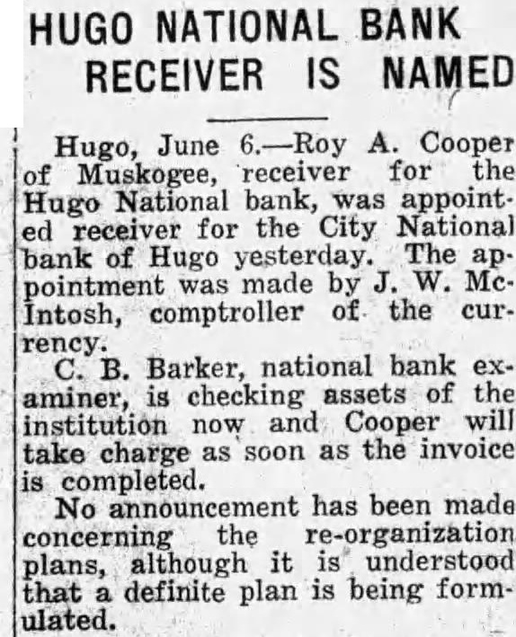 Hugo, June Cooper receiver for the Muskogee, Hugo National bank, was appointed receiver for the City National bank of Hugo yesterday. made by Intosh, comptroller of the curBarker, national bank aminer, assets of the and Cooper will institution now take charge as soon as the invoice completed. has been made concerning the re-organization although it understood plans, that definite plan is being formulated.