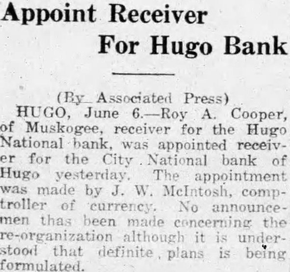 (By Associated Press) HUGO, June 6.-Roy A. Cooper, of Muskogee, receiver for the Hugo National bank, was appointed receivfor the City National bank of Hugo yesterday. The appointment was made by J. W. McIntosh, comptroller of currency. No announcemen thas been made concerning the re-organization although it is understood that definite plans is being formulated.