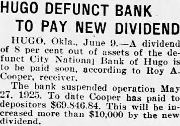 HUGO. Okla., June 9.-A dividend of 8 per cent out of assets of the defunct City National Bank of Hugo is Cooper, to be paid soon, according to Roy A. receiver. The bank suspended operation May 27. 1925. To date Cooper has paid to depositors $69 This will be increased dividend. more than $10,000 by the new
