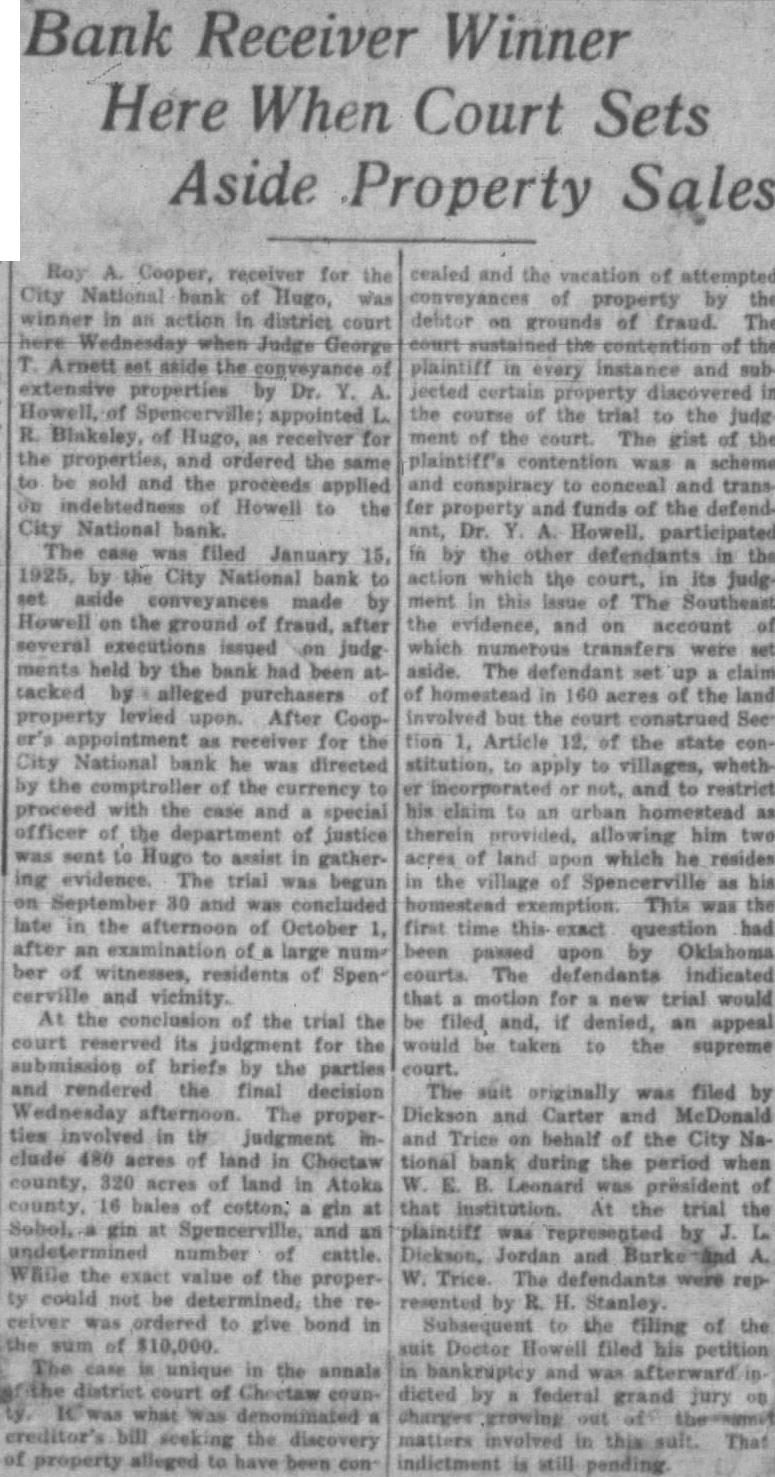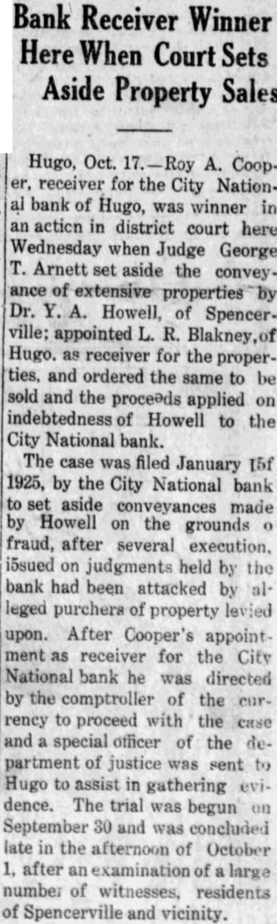 Hugo, Oct. Roy A. Cooper, receiver for the City National bank of Hugo, was winner in an action in district court here Wednesday when Judge George T. Arnett set aside the conveyance of extensive properties by Dr. Y.A. Howell, of Spencerville; appointed L. R. Blakney, of Hugo. as receiver for the properties, and ordered the same to be sold and the proceeds applied on indebtedness of Howell to the City National bank. The case was filed January [5f 1925, by the City National bank to set aside conveyances made by Howell on the grounds o fraud, after several execution, issued on judgments held by the bank had been attacked by alleged purchers of property levied upon. After Cooper's appointment as receiver for the City National bank he was directed by the comptroller of the currency to proceed with the case and a special officer of the department of justice was sent to Hugo to assist in gathering evidence. The trial was begun on September 30 and was concluded late in the afternoon of October 1. after an examination of a large number of witnesses, residents of Spencerville and vicinity.