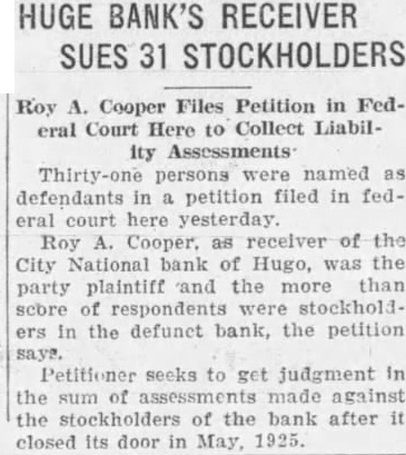 Roy A. Cooper Files Petition in Federal Court Here to Collect Liability Assessments Thirty-one persons were named as defendants in a petition filed in federal court here yesterday. Roy A. Cooper. as receiver of the City National bank of Hugo, was the party plaintiff and the more than scbre of respondents were stockhold ers in the defunct bank, the petition says. Petitic seeks to get judgment in the sum of assessments made against the stockholders of the bank after it closed its door in May, 1925.