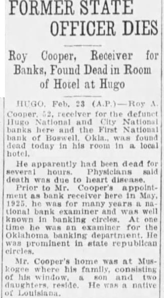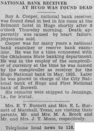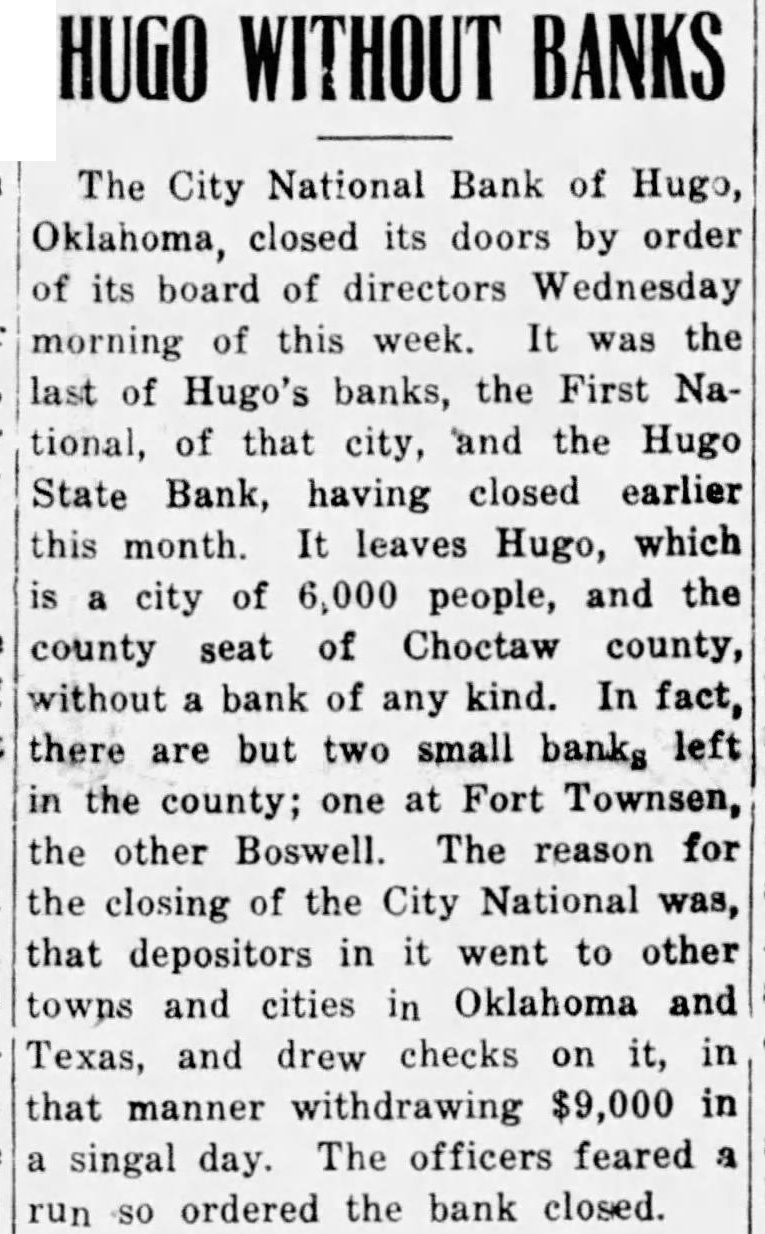 WITHOUT BANKS The City National Bank of Hugo, Oklahoma, closed its doors by order of its board of directors Wednesday morning of this week. It was the last of Hugo's banks, the First National, of that city, and the Hugo State Bank, having closed earlier this month. It leaves Hugo, which city of 6,000 people, and the county seat of Choctaw county, without bank of any kind. In fact, there are but two small banks left in the county; one at Fort Townsen, the other Boswell. The reason for the closing of the City National was, that depositors in it went to other towns and cities in Oklahoma and Texas, and drew checks on it, in that manner withdrawing in singal day. The officers feared run SO ordered the bank closed.
