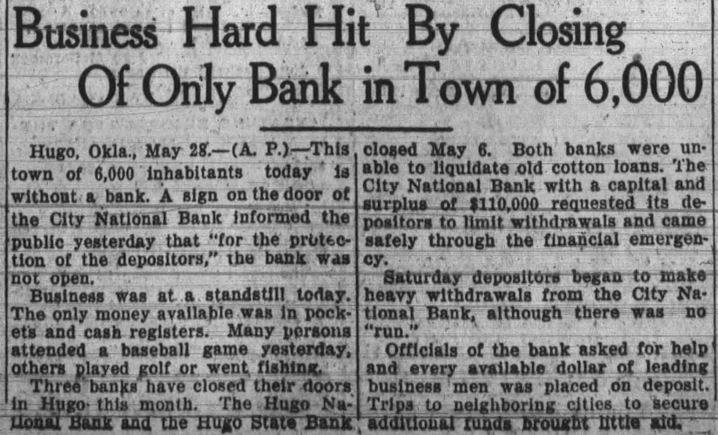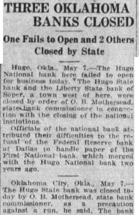 HUGO, Okla., May, Hugo National bank failed to open for business here today. The Hugo State bank and the Liberty State bank of Soper, town west of here, were closed by order of O. B. Mothersead in connection with the closing of the national institution. Officials of the National bank attributed their difficulties to the fusal of the federal reserve bank at Dallas to handle paper of the First National bank, which merged with the Hugo National bank two years ago. The City National bank of Hugo transacted business today as usual. It was said that it had sufficient cash to pay off all depositors if necessary. Depositors in the two closed banks include a number of the leading business concerns of the city. The closing was unexpected.