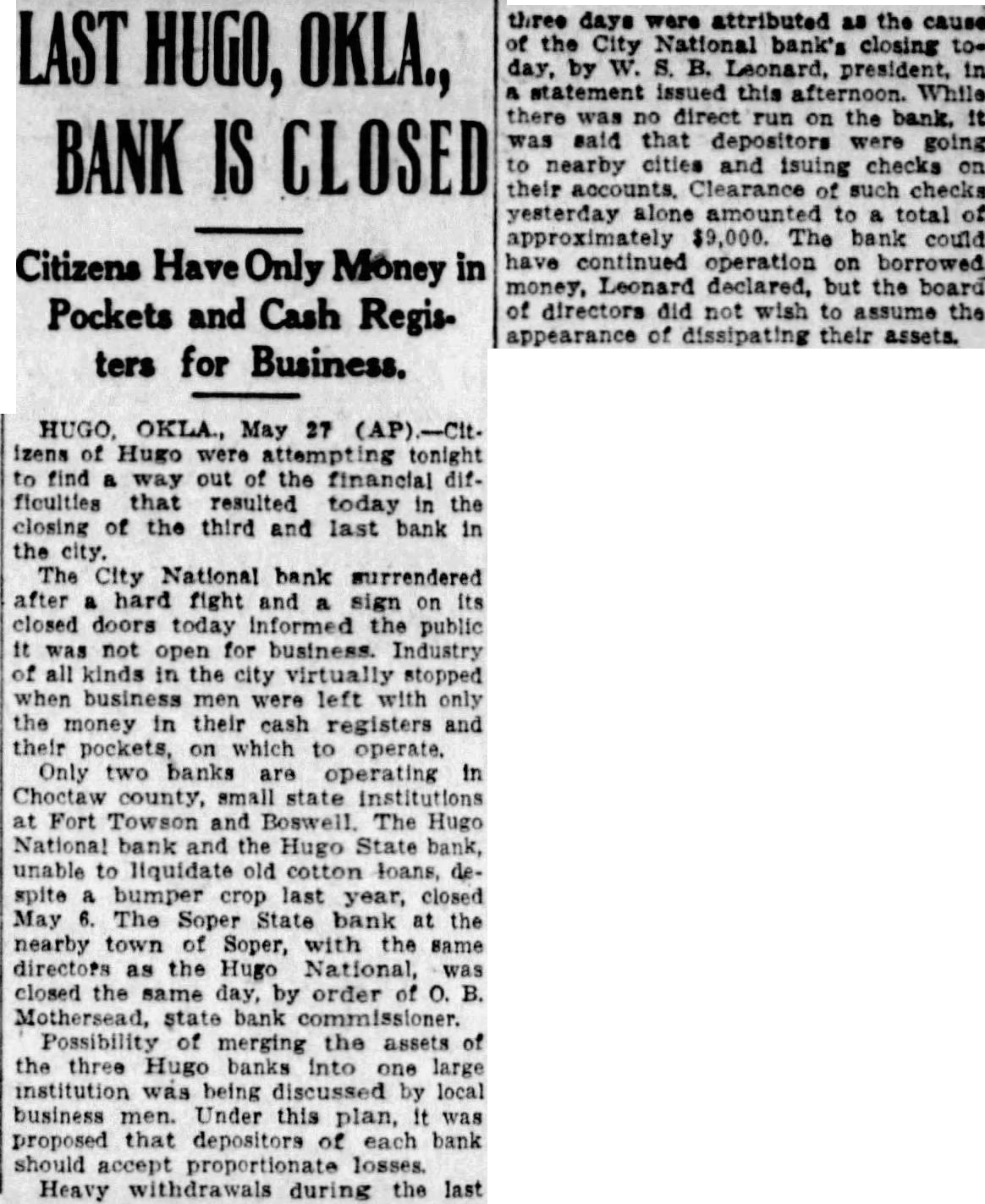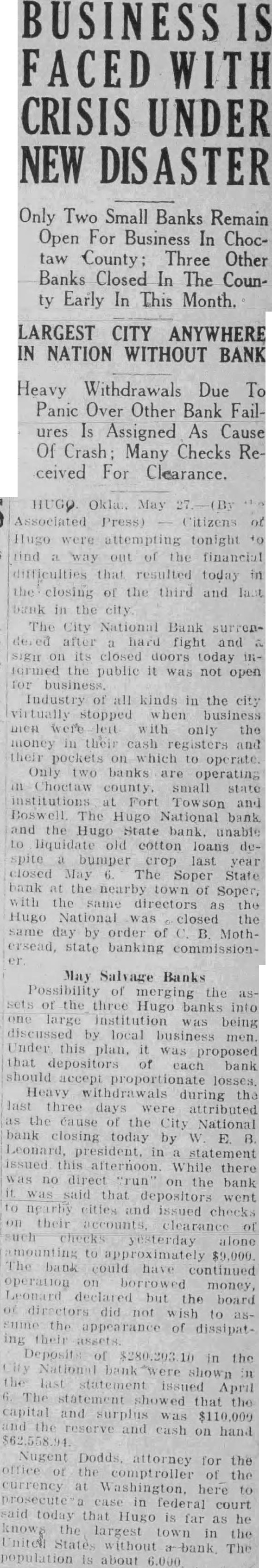Citizens Have Only Money in Pockets and Cash Registers for Business. izens of Hugo were attempting tonight to find way out of the financial difficulties that resulted today in the closing of the third and last bank in the city. The City National bank surrendered after hard fight and sign on closed doors today informed the public it was not open for business. Industry of all kinds in the city virtually stopped when business men were left with only the money in their cash registers and their pockets, on which to operate. Only two banks operating in Choctaw county, small state at Fort Towson and Boswell The Hugo National bank and the Hugo State bank, unable to liquidate old cotton loans, despite bumper crop last year, closed May The Soper State bank at the nearby town of Soper, with the same directors as the Hugo National, was closed the same day, by order of O. B. Mothersead, state bank commissioner. Possibility of merging the assets of the three Hugo banks into one large institution being discussed by local business men. Under this plan, was proposed that depositors of each bank should accept proportionate losses. Heavy withdrawals during the last three days were attributed as the cause of the City National bank's closing to day, by W. S. B. Leonard, president, in & statement issued this afternoon. While there was no direct run on the bank. it was said that depositors were going to nearby cities and isuing checks on their Clearance such checks yesterday alone amounted to total of approximately $9,000. The bank could have continued operation borrowed money, Leonard declared, but the board of directors not wish to assume the appearance of dissipating their assets.