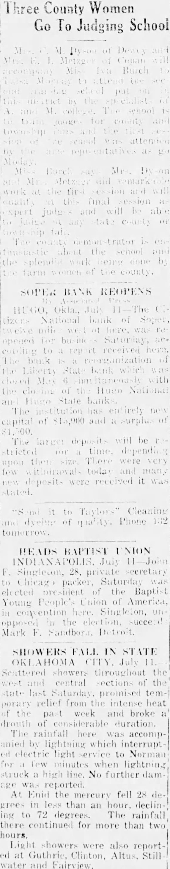 Okla., May Hugo National bank failed to open for business here The Hugo State Bank and the Liberty State Bank of Soper, town west of here closed by order of B. Mothersead in connection with the closing of the national institution. The Hugo State Bank was closed by O. B. Mothersead, state bank commissioner, as precaution against run, he said. The bank with the Hugo National Bank which failed to open had grounds close the has not failed, Mothersead said "The bank had fficient ordered it closed precaution, Mothersead said the Liberty State Bank of Soper, which he also ordered closed today, has same directorate as the Hugo National Officials the national bank attributed their difficulties the refusal the federal reserve bank at Dallas to handle paper the First National Bank, which merged the Hugo National Bank two The City National Bank of Hugo business today as It was said that had sufficient cash to pay off all depositors if Depositors in the two closed banks include number of the leading business concerns of the city, The closing was unexpected.