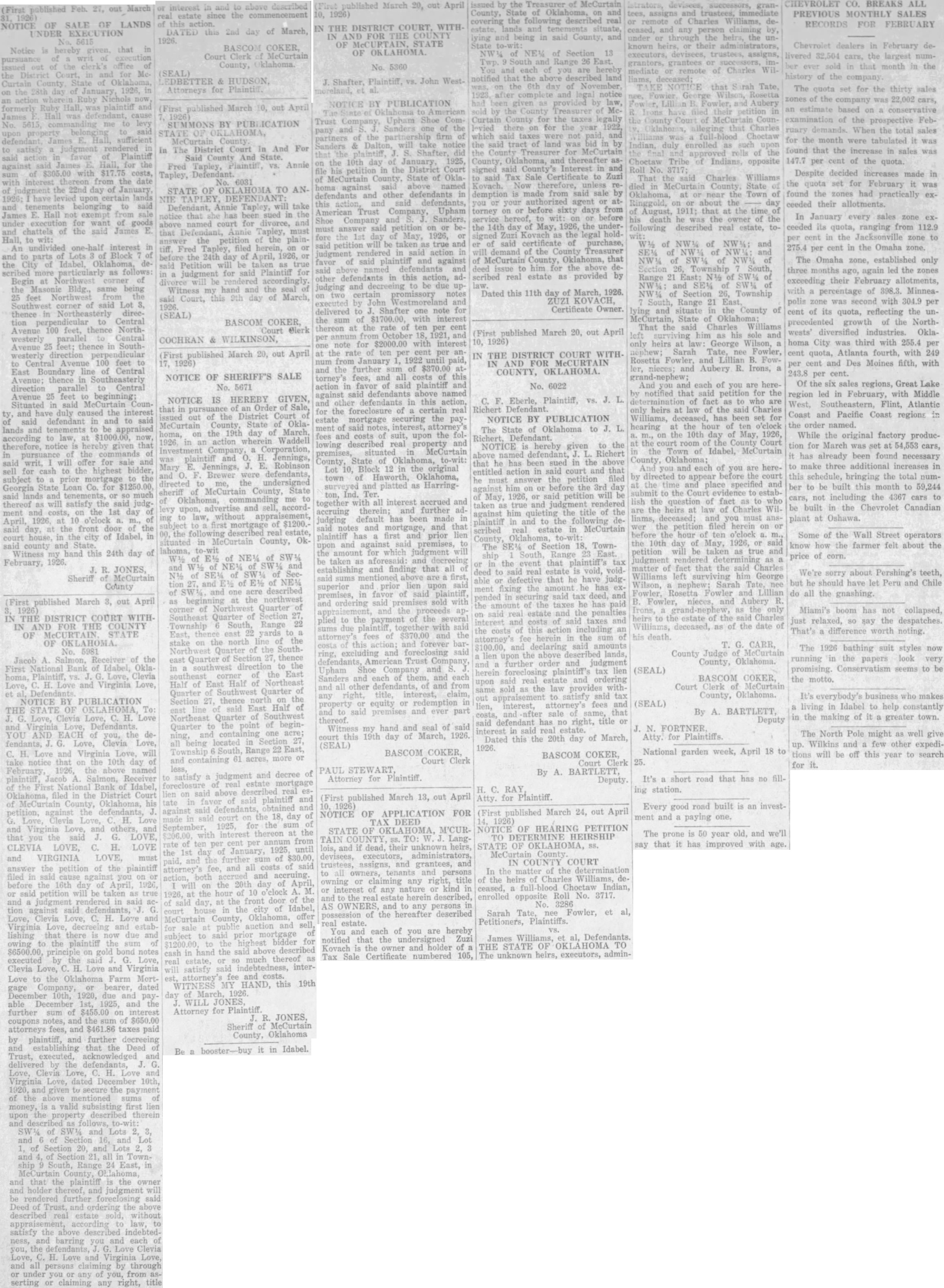 James Williams, et al, Defendants. THE STATE OF OKLAHOMA TO The unknown heirs, executors, admin- successors, grantees, assigns and trustees, remote of Charles Williams, deceased, and any person claiming under the heirs, the known heirs, their executors, devisees, trustees, assigns, grantors, grantees mediate remote of Charles Wilthat Tate Fowler Wilson, Rosetta Lillian Aubery have filed their petition in County Court of McCurtain Counalleging that Charles Choctaw Indian, duly enrolled as such upon rolls of the Choetaw Tribe of Indians, opposite Roll No. 3717; That said Charles Williams died McCurtain County, State Oklahoma, at near the Town or about the day August, 1911; that the death he was the owner of the following described real estate, toW½ of NW% of NW%; and of of and NW% of of NW% 26, Township South, Range 21 East: of of and SE% of SW% of NW% of Section Township South, Range 21 East, and situate the County of State of That the said Charles Williams him as his sole and only heirs at law George Wilson, Sarah Tate, Fowler, Rosetta Fowler, and Lillian Fowler, nieces; Aubery R. Irons, And you and each of you are herenotified that said petition for the determination of fact as to who are heirs at law of the said Charles illiams, deceased, has been set for hearing the hour of ten o'clock on the 10th day of May, 1926, the court room of the County Court the Town of Idabel, McCurtain Oklahoma; And you and each of you are heredirected to appear the court the time and place specified and submit to the Court to establish the question of fact as to who are the heirs at law of Charles Williams, and you must answer the petition filed herein on or before the hour of ten o'clock the 10th May, 1926, or said petition will be taken as true and judgment rendered matter fact that the said Charles left surviving him George Sarah Fowler, Rosetta Fowler and Lillian Fowler, nieces, and Aubery R. Irons, as the only heirs to the estate of the said Charles Williams, deceased, as of the date of death.