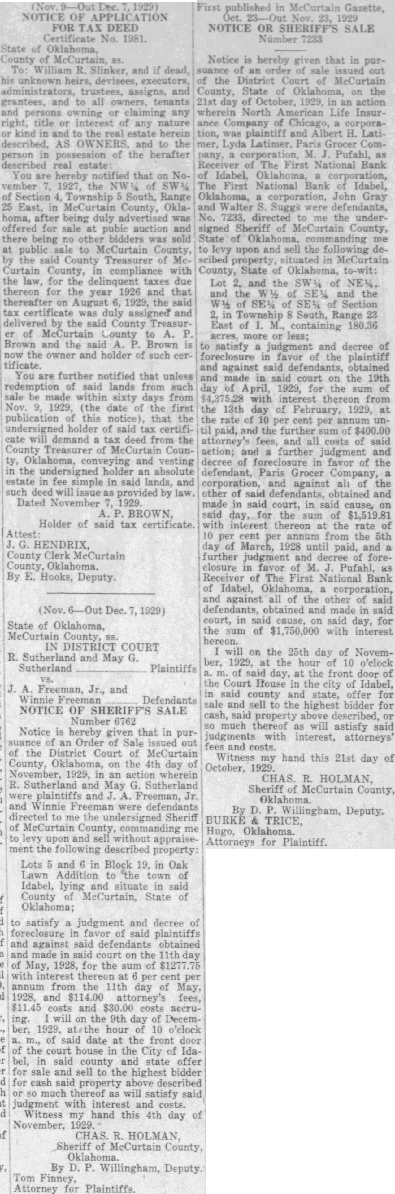 You and each of you are hereby notified that the undersigned Zuzi Kovach is the owner and holder of Tax Sale Certificate numbered 105, issued by the Treasurer of McCurtain County, State of Oklahoma, on and covering the described real lands and situate, lying and being in said County, and State of NE% of Section 13 Twp. South and Range 26 East. and each you are hereby notified that the above land the 6th day of November, legal notice been given provided by law, by the Treasurer Curtain County for the taxes levied there on for the year which said taxes were not and the said tract of land was by the County Treasurer for McCurtain Oklahoma, and thereafter County, signed said County's Interest in and said Tax Sale Certificate to Zuzi Kovach. Now therefore, unless demption is made from said sale authorized agent or your torney or before sixty days from hereof, wit: on before service the 14th day May, 1926, the undersigned Zuzi Kovach as the legal holdof said certificate of purchase, demand of the County Treasurer of McCurtain County, Oklahoma, that deed issue to him for the above described real estate as provided by Dated this 11th day of March, 1926. ZUZI KOVACH, Certificate Owner.