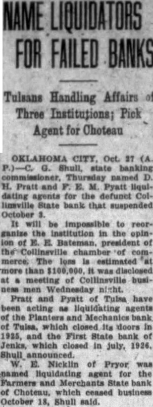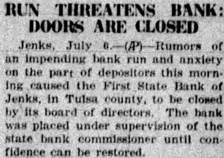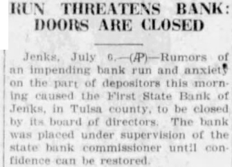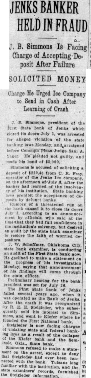 B. Simmons, president of the First State bank of Jenks which closed its doors July 3, was arrested for alleged violation of the state before Common Pleas Judge Saul A. Yager. He pleaded not guilty, and made his bond of $5,000. Simmons is accused of soliciting deposit of $220.40 from C. R: Fray, operator the Jenks Ice company, on the afternoon 3, after the banker had learned of the insolvenof his institution. State banking laws prohibit the acceptance of deposits by defunct banks Rumors of a threatened run on the bank caused it to close its doors July 3. according to an announcement by officials, who said at the they had full confidence in the institution's solvency, but desired an audit by the state bank examiner to restore the faith of worried deW. Schoffmer, Oklahoma City, state bank examiner, is conducting an audit of the First State bank now. He declined to make statement on the progress of his investigation Monday, saying that announcement of his findings will come through the state offices. Preliminary hearing for the bank president was set for July 26. The First State bank of Jenks failed several years ago, when It was operated as the Bank of Jenks. After the crash It was reorganized by R. E. E. Steigleder, who subsequently sold his Interest to Simmons, and went to Kiefer where he founded the First National bank. Steigleder is now facing charges of violating state and federal bankIng laws result of the collapse of the Kiefer bank and the Seminole, Okla., State bank. Simmons refused to make a statement on the arrest, except to deny that Steigleder had ever been connected with the bank. Tulsans long familiar with the institution, and the state examiners' records, furnished the Steigleder information.
