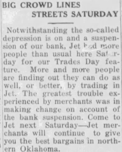 Notwithstanding the so-called depression is on and a suspension of our bank, Jet had more people than usual here Satur day for our Trades Day feature. More and more people are finding out they can do as well, or better, by trading in Jet. The greatest trouble experienced by merchants was in making change on account of the bank suspension. Come to Jet next Saturday-Jet merchants will continue to give you the best bargains in northern Oklahoma.