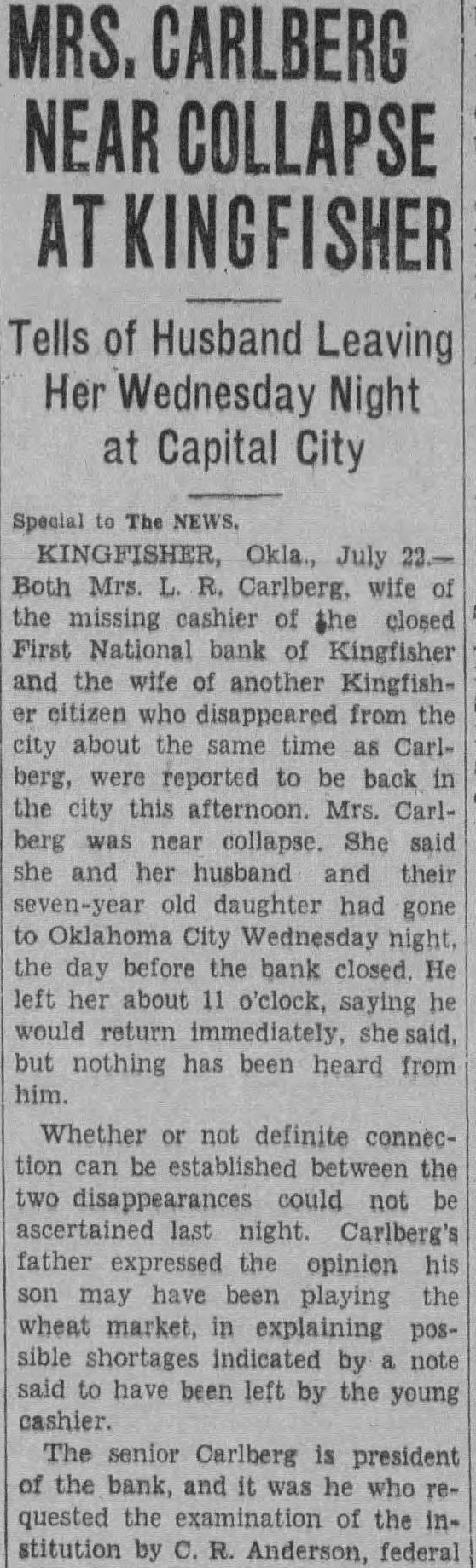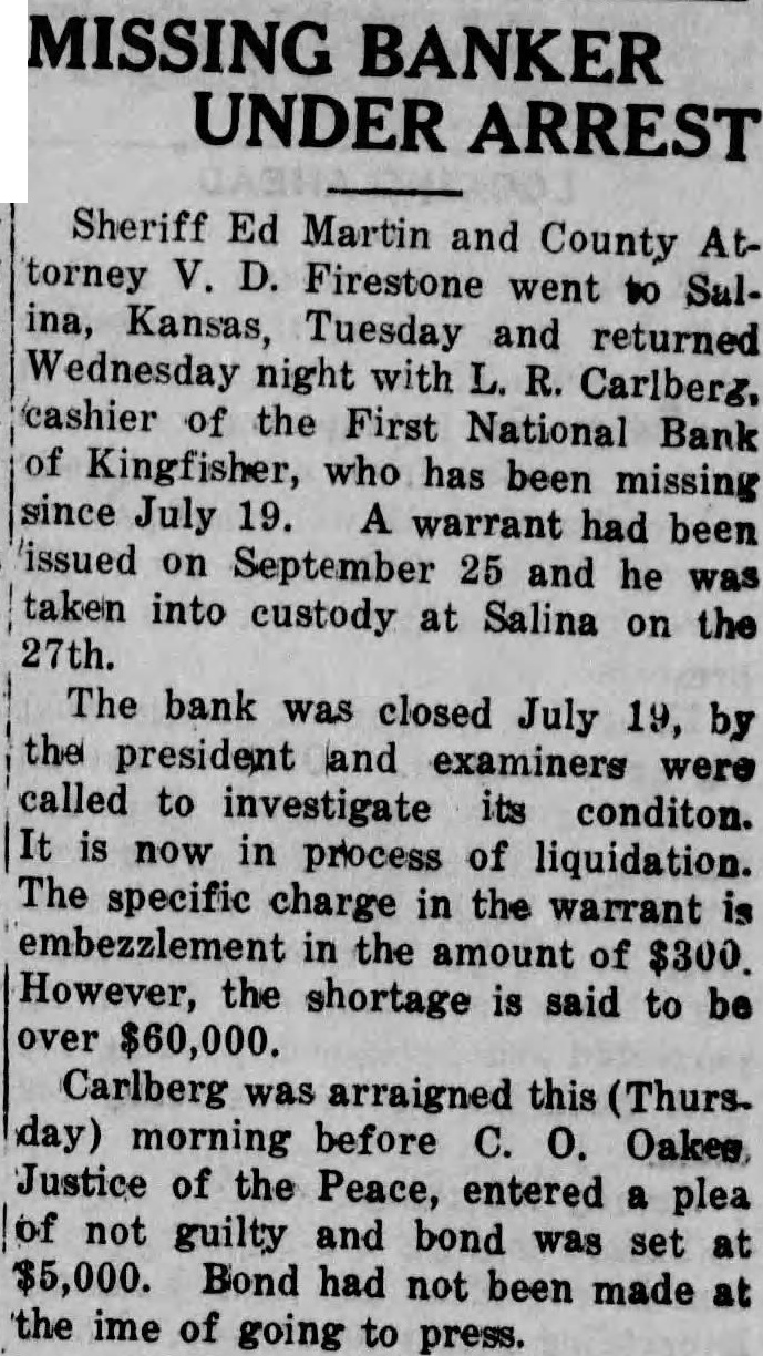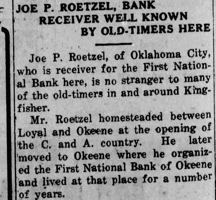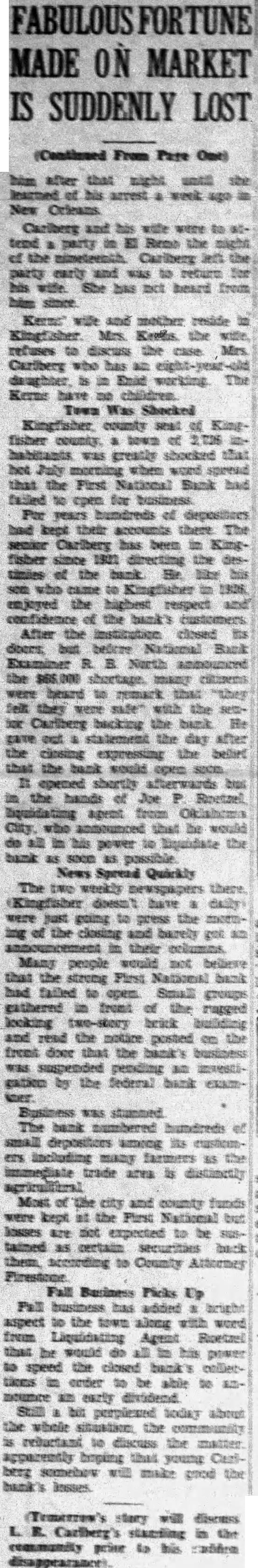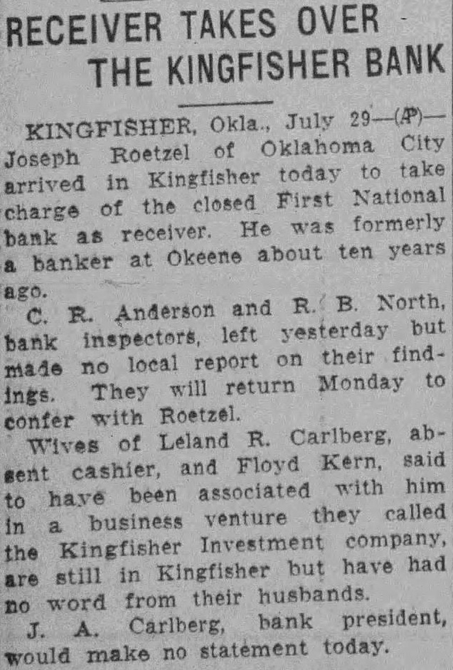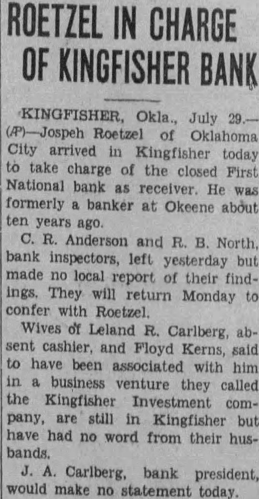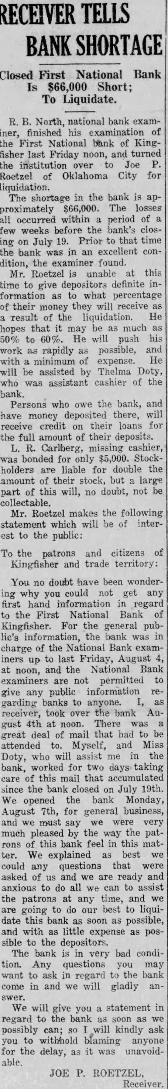 North, national bank iner, finished his examination the First National bank Kingfisher Friday and turned the institution over Joe Roetzel of Oklahoma City for liquidation. shortage in the bank $66,000. The losses proximately all occurred within period of few weeks before the bank's July Prior to that time on the bank was in an excellent dition, examiner found. Roetzel unable this time to give depositors definite formation as what percentage their they will receive money result of the liquidation. He hopes that may much He will push his work rapidly possible, minimum of He expense. will assisted by Thelma Doty, assistant cashier of the bank. Persons who the bank, and have deposited there, will money receive credit their loans for the full amount of their deposits. Carlberg, missing cashier, bonded for only $5,000. holders liable for double the amount of their stock, but large of this will, no doubt, not collectable. Roetzel makes the following statement which will be of to the public: