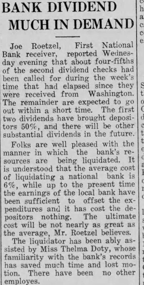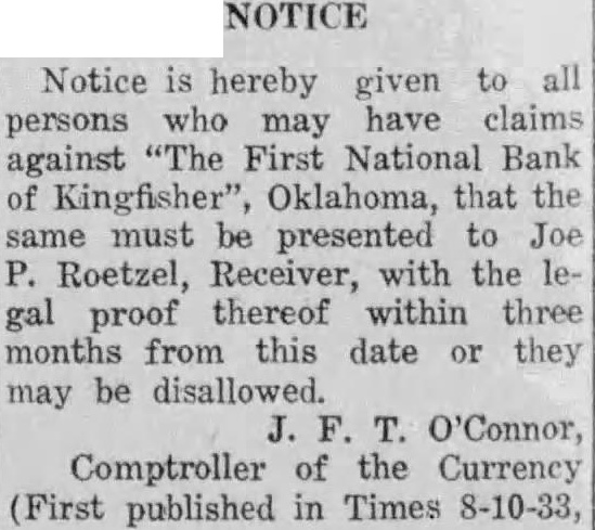 You doubt have been wonderno why could not any you first hand information regard the First National Bank Kingfisher. For the general the bank charge of the National Bank iners up to last Friday, August and the National Bank noon, examiners not permitted public information any garding banks to anyone. receiver, took the bank August at noon. There great deal of mail that had to attended Myself, and Miss who will assist in the Doty, bank, worked for two of this mail that accumulated care since the bank closed July 19th. We opened the bank Monday, August 7th, for general business, and must were much pleased by the way the this bank feel in this matter. We explained best could questions that any asked of and are ready and anxious to do all can to assist the patrons any time, and going to do our best to liquidate this bank soon possible, and with as expense as sible to the depositors. The bank bad condition. Any questions may to the bank regard in and will gladly will give statement you regard to the bank as possibly can; kindly ask to withhold blaming anyone for the delay, unavoid-