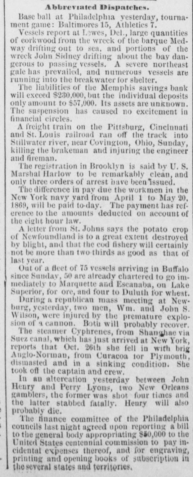 venicie with mem They were taken before Commissioner Osborne, No held in $8,000 each for trial. to one and to bail them, and *they James Blood, Wm. were Colonel appeared taken Ludlowstreet jail. editor and Woodhull and Claflin's Weekly, A. Smith, its publisher, were arrested district and locked up at the second of police court this P. M., in default for examination. The intense feeling bail, against Woodhull and Claflin is of throughout the city, and threats ed in. mobbing them have been freely indulgTHE "STRAIGHT-OUT" ELECTORAL of TICKET!-The following is the result James the conference between Mr. Lyons and the five other Straight-outs Hotel who assembled at the Exchange in Richmond. "The Democrats lately assembled in Richmond, few in number, but representing, as they believe, the true Demo- the cratic party of the State, submit to people of Virginia for their suffrages at the approaching Presidential election, the following Electoral ticket, viz: First District- Gabriel Johnson. Second District- D. Parker. Third District-Robert Graeme. Fourth District- Edwing J. Harvie. Fifth districtSfxth District- Hon. John Robertson. Seventh District- Campbell. Eight District- Gen. J. M. Bethune. Ninth Districtand Districts being "No Ninth representatives from present, the Fifth no Electors for those districts are named, reand the people of those districts are quested to vote for such person as they may choose Elector. J. As Electors at large-Hon. W Robertson and Hon. James Lyons. AWFUL ACCIDENT. Two wine-grow in ers, named Rousseau, were employed throwing grapesinto a vat at Gevvey, recently, and a man to treat them, but was down France, fermentation. suffocated was sent arising from to of the proprietors went One by the gases down fate help him, and shared the same The survivor followed, and was likewise prostrated. Their mother then when went down and was overpowered, and that taken out she was the only one could be brought back to consciousness NEW YORK, October 0.-Mrs. Mary S Greeley, wife of Hon. Horace Greeley, died this morning at the residence the of Mr. Alvin Johnson. During evening yesterday her symptoms were inof such a favorable character as to spire some faint hopes of her recovery Such expectations, however, prove durunfounded, as she had two chills ing the night, after she was very easy M., until she ceased to breathe at 4 A. passing away peacefully, without will any perceptible struggle. The funeral take place from Dr. Chapin's Church, at 12 o'clock, Friday. ESCAPED.- Five thousand sadly dis slowly took their way from on the morning homeward Carolinia, appointed people Hendersonville, of the witness North 25th had assembled to execution of one Martin of the murder of a convicted ult. the They Baynard, certain and his three children. was prepared, to Silas The gallows Weston the expectation show the stretch waiting for on when intelligence was that if the play was commence, brought acted must that day the important principal part of necesity be cut out. The prisoner his had escaped the previous night in wife's clothes, and the humane and gentle country folk, balked of their specette. tacle,grumblingly dispersed.-Bul GazWilliam Craig, a negro, charged Mrs. with committing a rape on the person of a white woman years of near New Creek, two Lottie age, Dayton about 74 in the months ago, was tried last week at Circuit Court of Allegany county, Comberland, found guilty'an sentenced The by Judge Pearre to be hanged. day of execution will be fixed by the Governor of Maryland. It is said that "the original Declaration of Independence is fading out. And the duce of it is, we haven't among Jeffer our statesmen a single Thomas son to write another The Memphis Savings Bank has suspended payment. Its liabilities are reported at $175,-000. The Southern life Railway security and the Carolina the Insurance Company are said to be has heaviest losers. The institution hitherto been regarded as perfectly solvent. WhiTE LABOR IN THE SOUTH. The popular fallacy that white laborors canendure the heat of the cotton, sugar and of the is ex the New Orleans not ploded rice by plantations South, Picayune, workwhich says that white laborers are of in the fields all over the State Louisiana ing the year round as low down tide water from the Gulf of Mexico, as and the islands along the Gulf shore. And these laborers are not more sickly in than colored men, or men who stay the shade. DEFALCATION OF PUBLIC OFFICIALS. correspondent says report of the forthcoming A Washington second due audi- the the show a large amount States of defaulting due from paymasters United amount tor will officers. is number shown The to be nearly $670,000. forcest friend The unleas involving