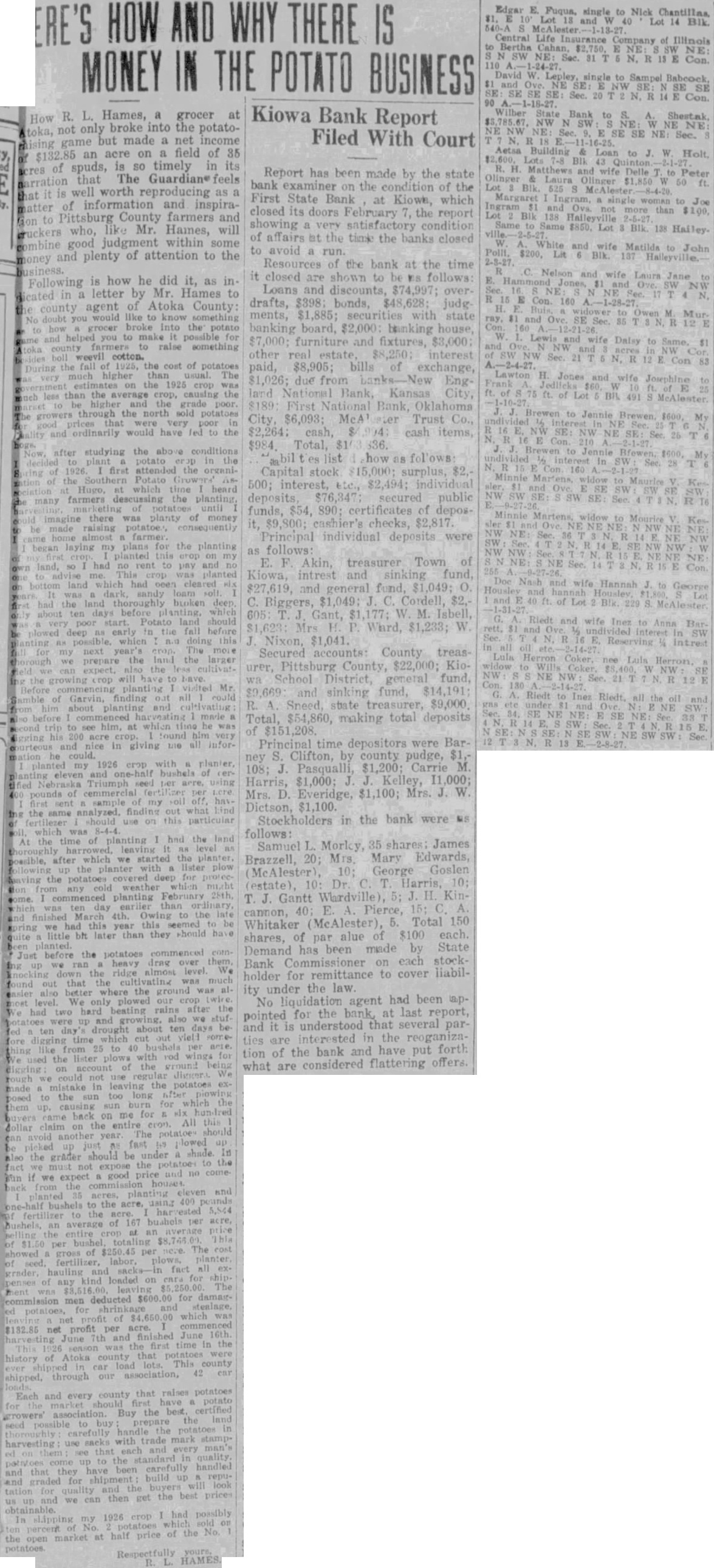 ERE'S HOW AND WHY THERE IS MONEY IN THE POTATO BUSINESS How R. L. Hames, a grocer at toka, not only broke into the potatogame but made a net income $132.85 an acre on a field of 35 of spuds, is SO timely in its that The Guardian feels is well worth reproducing as matter of information and inspirato Pittsburg County farmers and bruckers who, Mr. Hames, will good judgment within some and plenty of attention to the Following is how he did it, as in in a letter by Mr. Hames to county agent of Atoka County like to doubt you grocer into the potato and you to possible for farmers to raise something weevil cotton. fall 1925, the cost of potatoes the higher than usual The the 1925 less than the average causing the higher the grade through the north sold potatoes that were very poor and have the studying the above conditions after in 1926 first attended the organithe time many farmers descussing the planting there was planty made farmer plans for the planting land, had cleared thoroughly broken deep fall The prepare the the Mr. of finding and he was 200 him in giving my 1926 with planier crop and bushels Triumph cemmercial the finding out same was of planting the the level which we started the planter after for the planting February March the this this be bit than they should before the heavy over them We that was better where the rains had two about ten time the use the to the on me All The the and acre, The deducted was net per the every and for the best prices we can then get obtainable. possibly 1926 crop sold half of the at price the market Respectfully HAMES. Kiowa Bank Report Filed With Court Report has been made by the state bank examiner on the condition of the First State Bank at Kiowe, which closed its doors February the report showing a very satisfactory condition of affairs at the time the banks closed to avoid Resources of the bank at the time it closed are shown to be MS follows: Loans and discounts, $74,997; over drafts, $398 bonds, $48,628; judg ments, $1,885; securities with state banking board, $2,000 banking house, furniture and fixtures, $3,000 other interest paid, $8,905; bills of exchange, $1,026; due from banks-New England National Bank, Kansas City, $189 First National Bank Oklahoma City, $6,093; McA ster Trust Co., $2,264: cash, 14 cash items list how as follows: Capital stock $15,000 surplus, $2. 500; interest, $2,494; deposits $76,347 secured public funds, $54, 890: certificates of deposPrincipal individual deposits were as E. F Akin, treasurer Town of Kiowa, intrest fund, Gant, W Isbell $1,233; W J. Nixon, $1,041. Secured accounts: County treasPittsburg County, $22,000; Kio District, general fund $9,669 sinking fund, $14,191 R. $9,000 Total $54,860, making total deposits of $151,208 Principal time depositors were Bar ney S. Clifton, by county pudge, 108; J Pasqualli $1,200: Carrie M $1,000 J. J. Kelley, Harris, Mrs. D. Everidge, $1,100; Mrs. J. W Dictson, $1,100 Stockholders in the bank were MS Samuel L. Morky, 35 shares James Brazzell 20; Mrs, Mary Edwards, George Goslen Mc Dr. T Harris, 10: T J. Gantt Wardville), 5; H. Kincannon, Pierce, Whitaker McAlester), Total 150 shares, of par alue of $100 each. Demand has been made by State Bank Commissioner on each stock holder for remittance to cover liabil under the law ity No agent had been ap pointed for the bank at last report, and it is understood that several par ties are interested in the reoganiza tion of the bank and have put forth considered flattering what Edgar E. Fuqua, single to Nick Chantillas and Lot 14 Blk. Central Bertha Life Insurance Company of Illinois E NE SW 110 SW NE See. 31 N. R 13 E NE Con. David single to Sampel Babcock and NE SE SE: See. 20 R 14 SE Con. SE Wilber State Bank Shestak NW NE NE NE NW NE: SE SE NE: N. Aetsa Building to W. Blk Olinger H. Matthews & and wife Delle Peter $1,850 50 Lot woman Joe Ingram and Ova not more than $100, Blk Same Lot 138 Blk. White and wife Matilda to $200, Lit Blk. 137 John Nelson and wife Laura Jane to SW NW Con. 160 Owen and SE 85 W wife to and NW Sec. R Con 83 Lawton H. Jones wife Josephine E ft. 491 S J. Jennie $600, NE T See SW See NE See NE NE Con and Hannah to Bar nee NE See Riedt SW See