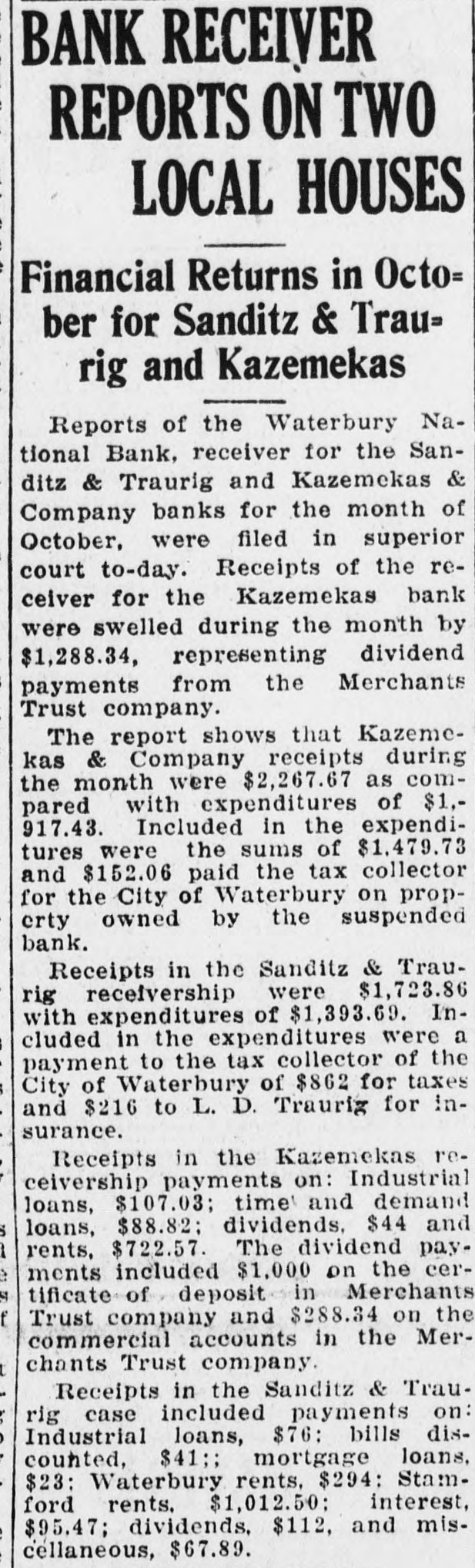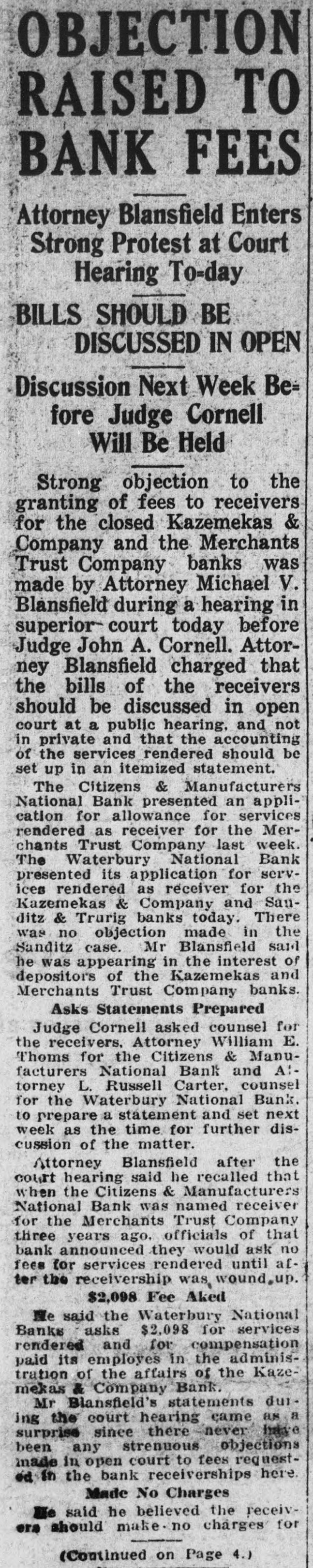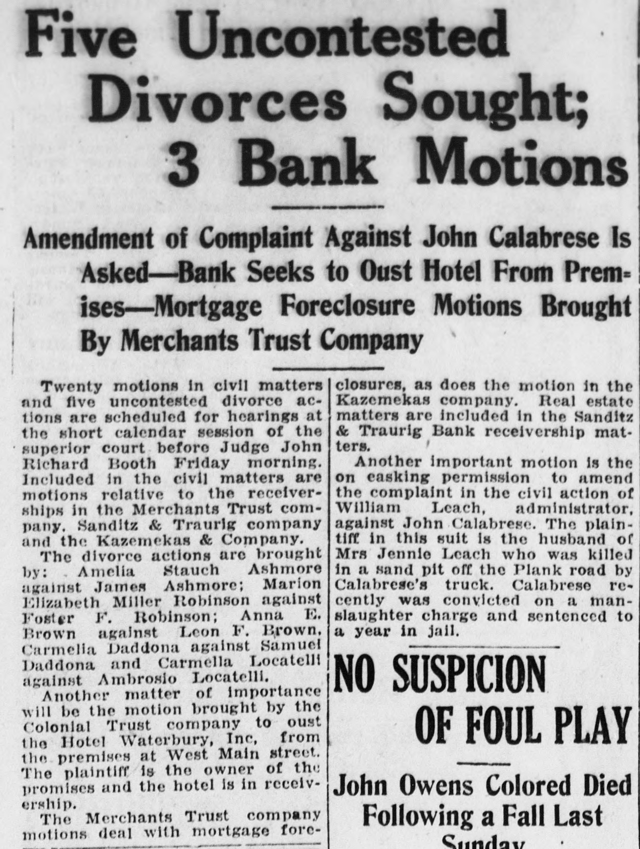 Five Uncontested Divorces Sought; 3 Bank Motions Amendment of Complaint Against John Calabrese Is Asked-Bank Seeks to Oust Hotel From Prem= ises-Mortgage Foreclosure Motions Brought By Merchants Trust Company closures, as does the motion in the Twenty motions in civil matters Kazemekas company. Real estate and five uncontested divorce acmatters are included in the Sanditz tions are scheduled for hearings at the short calendar session of the & Traurig Bank receivership matters. superior court before Judge John Another important motion is the Richard Booth Friday morning. on easking permission to amend Included in the civil matters are the complaint in the civil action of motions relative to the receiverWilliam Leach, administrator, ships in the Merchants Trust comagainst John Calabrese. The plainpany. Sanditz & Traurig company tiff in this suit is the husband of and the Kazemekas & Company. Mrs Jennie Leach who was killed The divorce actions are brought in a sand pit off the Plank road by by: - Amelia Stauch Ashmore Calabrese's truck. Calabrese reagainst James Ashmore; Marion cently was convicted on a manElizabeth Miller Robinson against slaughter charge and sentenced to Foster F. Robinson; Anna E. a year in jail. Brown against Leon F. Brown. Carmelia Daddona against Samuel Daddona and Carmella Locatelli against Ambrosio Locatelli. NO SUSPICION Another matter of importance will be the motion brought by the Colonial Trust company to oust OF FOUL PLAY the Hotel Waterbury, Inc, from the premises at West Main street. The plaintiff is the owner of the promises and the hotel is in receivJohn Owens Colored Died ership. The Merchants Trust company Following a Fall Last motions deal with mortgage foreSunday