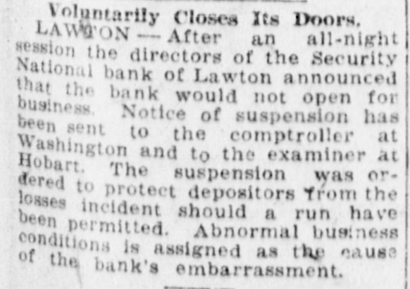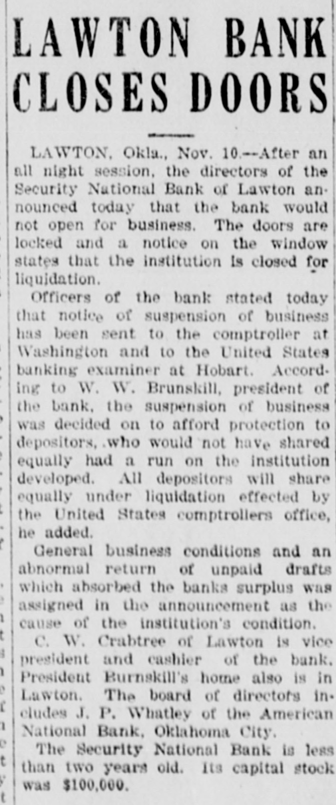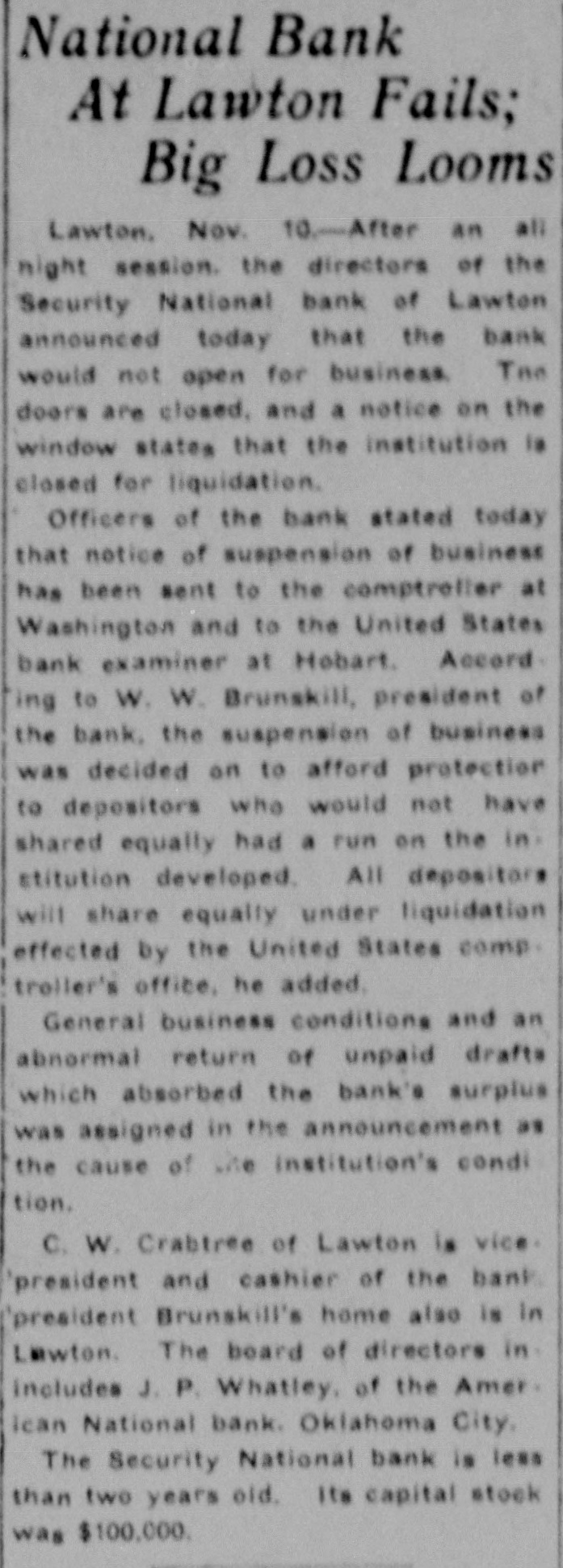 National Bank At Lawton Fails; Big Loss Looms Lawton, Nov. 10.-After an all night session. the directors of the Security National bank of Lawton announced today that the bank would not open for business The doors are closed. and a notice on the window states that the institution is closed for liquidation. Officers of the bank stated today that notice of suspension of business has been sent to the comptreller at Washington and to the United States bank examiner at Hobart. Accord ing to W. W. Brunskill, president of the bank, the suspension of business was decided on to afford protection to depositors who would not have shared equally had a run on the in stitution developed. All depositors will share equally under liquidation effected by the United States comp troller's office. he added, General business conditions and an abnormal return of unpaid drafts which absorbed the bank's surplus was assigned in the announcement as the cause of we institution's condi tion. c. W. Crabtree of Lawton is vice. president and cashier of the bank 'president Brunskill's home also is in Lewton. The board of directors in includes J. P. Whatley. of the Amer ican National bank. Oklahoma City. The Security National bank is less than two years old. its capital stock was $100,000.
