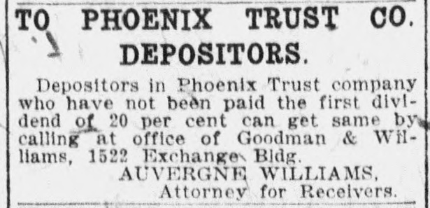 # TO PHOENIX TRUST CO. # DEPOSITORS. Depositors in Phoenix Trust company who have not been paid the first divi- dend of 20 per cent can get same by calling at office of Goodman & Wil- liams, 1522 Exchange Bldg. AUVERGNE WILLIAMS, Attorney for Receivers.